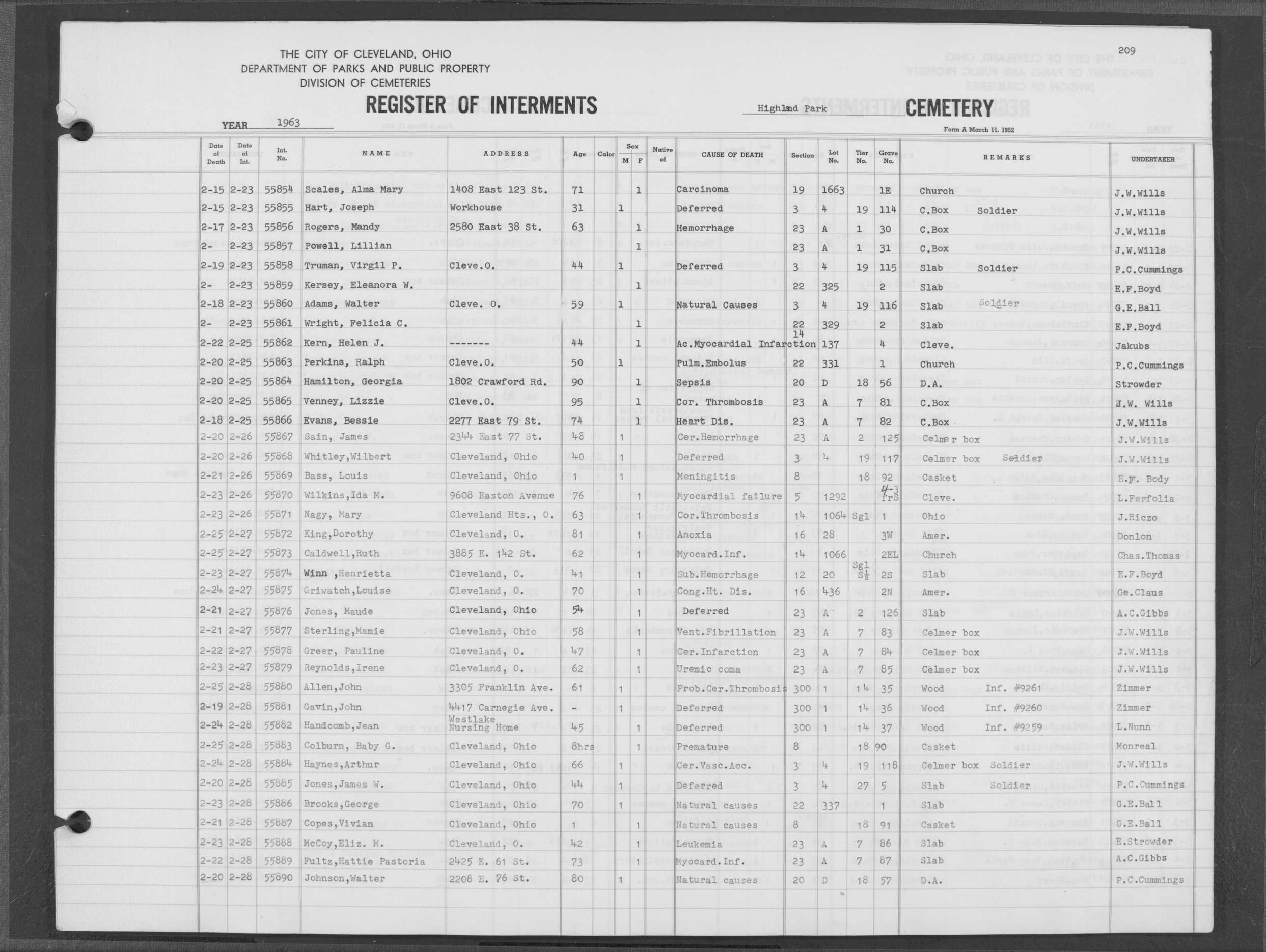 | Highland Park | 6 | 209 | Feb | 20 | 1963 | Feb | 25 | 1963 | 55863 | Perkins, Ralph | 50y | M | ||