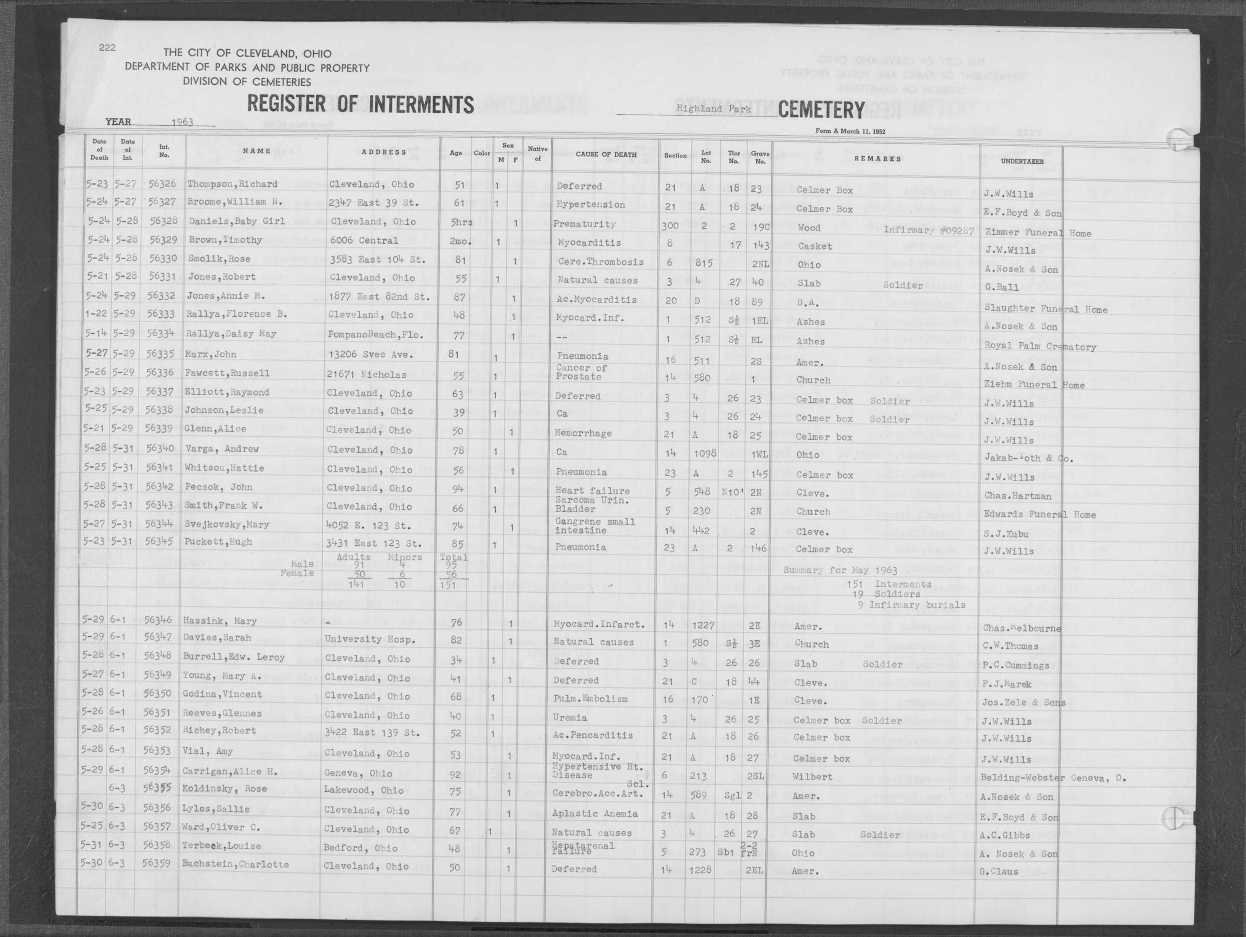 | Highland Park | 6 | 230 | Jul | 18 | 1963 | Jul | 22 | 1963 | 56631 | Payne, Alice | 57y | F | ||