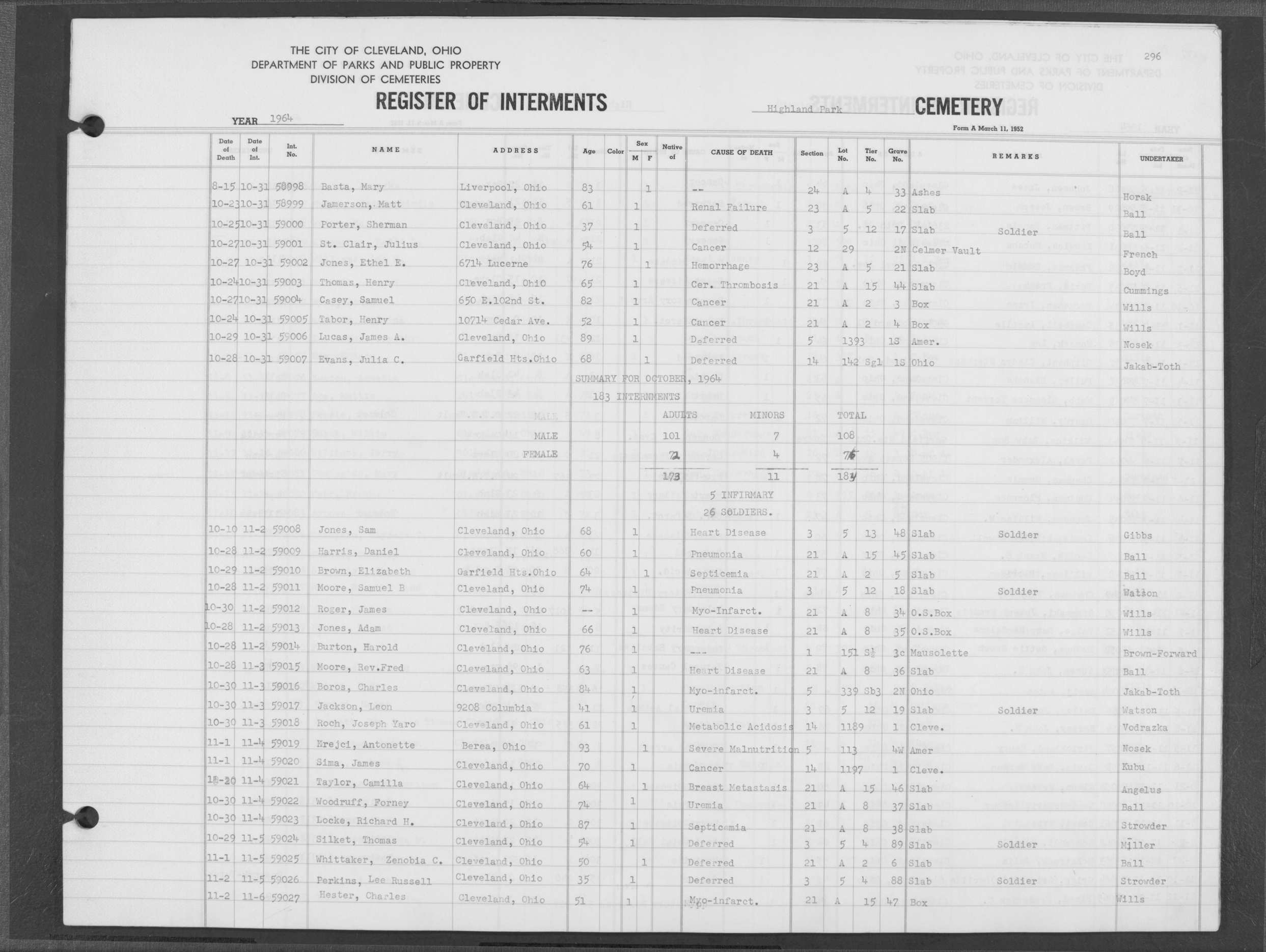 | Highland Park | 6 | 296 | Nov | 2 | 1964 | Nov | 5 | 1964 | 59026 | Perkins, Lee Russell | 35y | M | ||