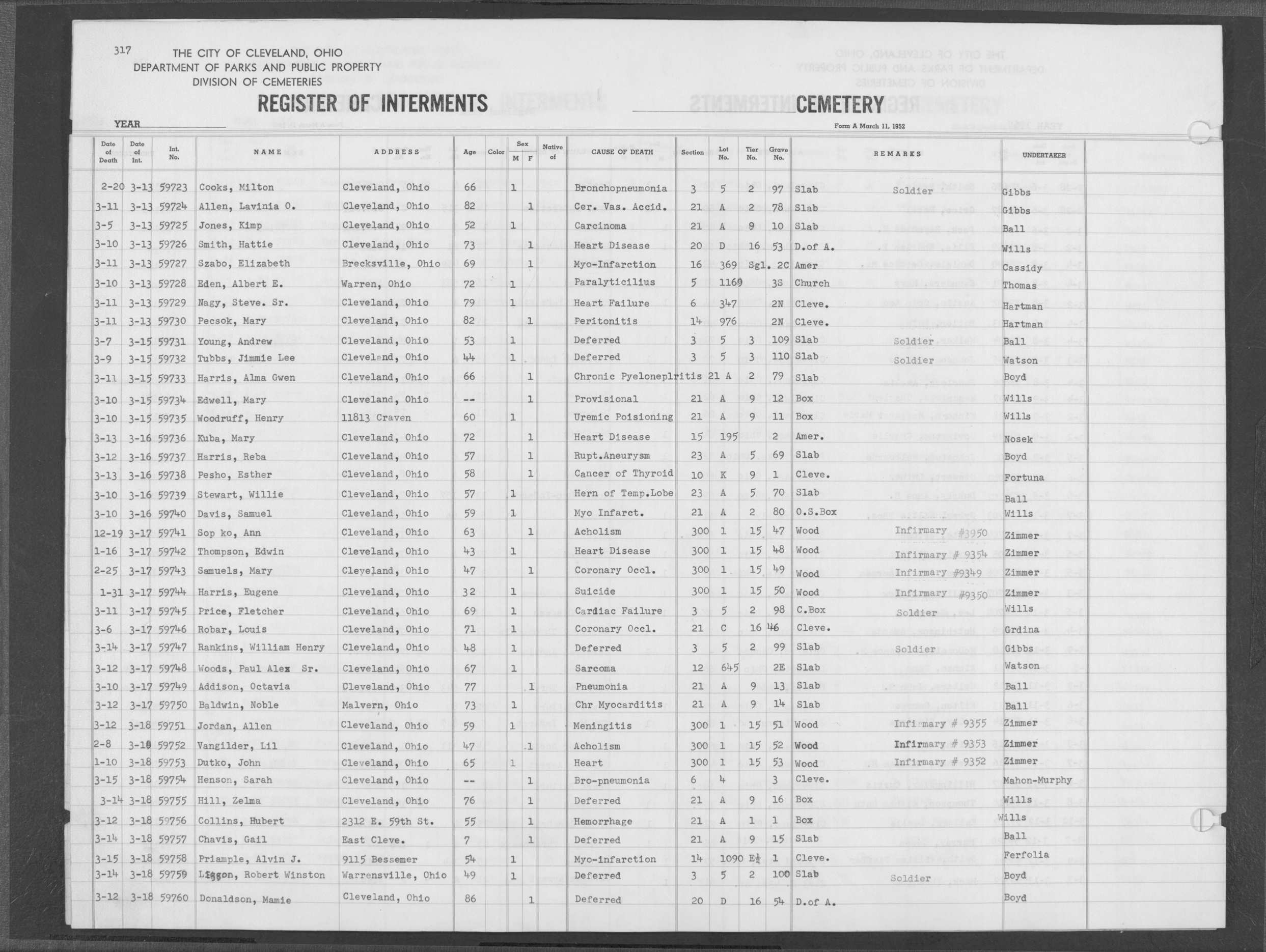 | Highland Park | 6 | 17 | Nov | 2 | 1958 | Nov | 6 | 1958 | 49027 | Perkins, Lizzie | 62y | C | F | |