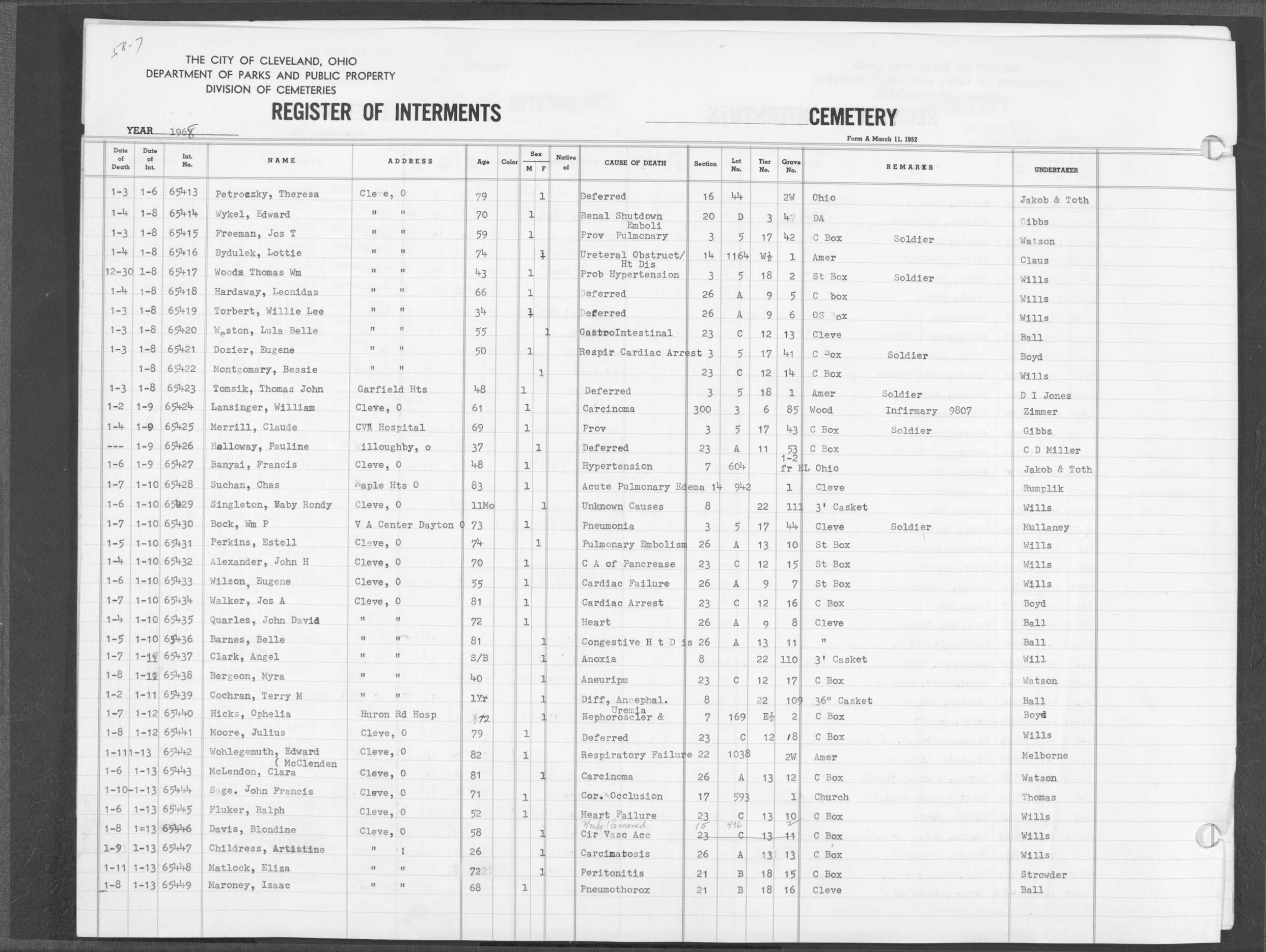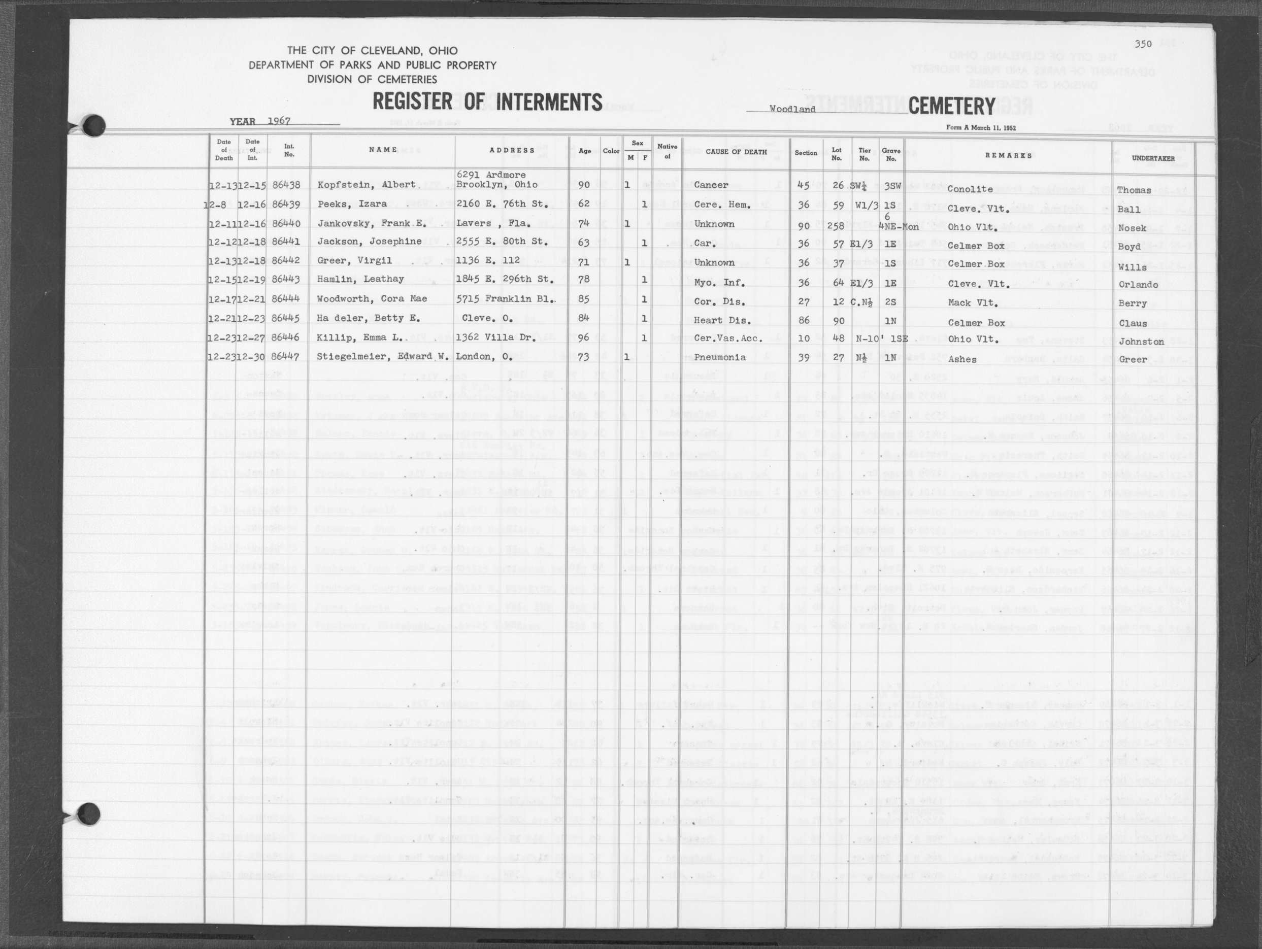 | Highland Park | 6 | 70 | Jan | 10 | 1960 | Jan | 14 | 1960 | 50923 | Perkins, Lillian M | 76y | W | F | |
