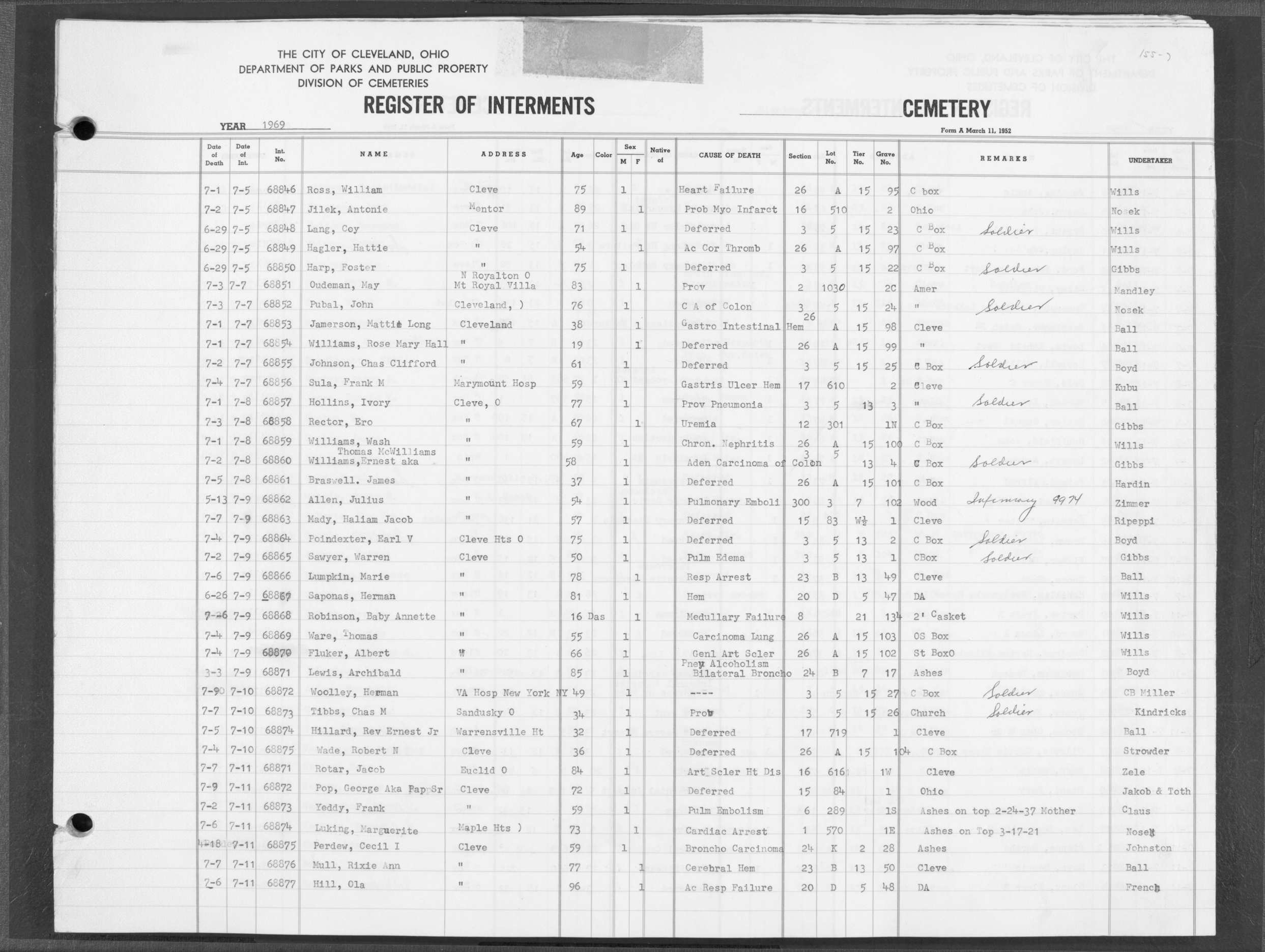 | Highland Park | 7 | 109 | Nov | 1 | 1968 | Nov | 7 | 1968 | 67239 | Perkins, Ruth | 63y | F | ||