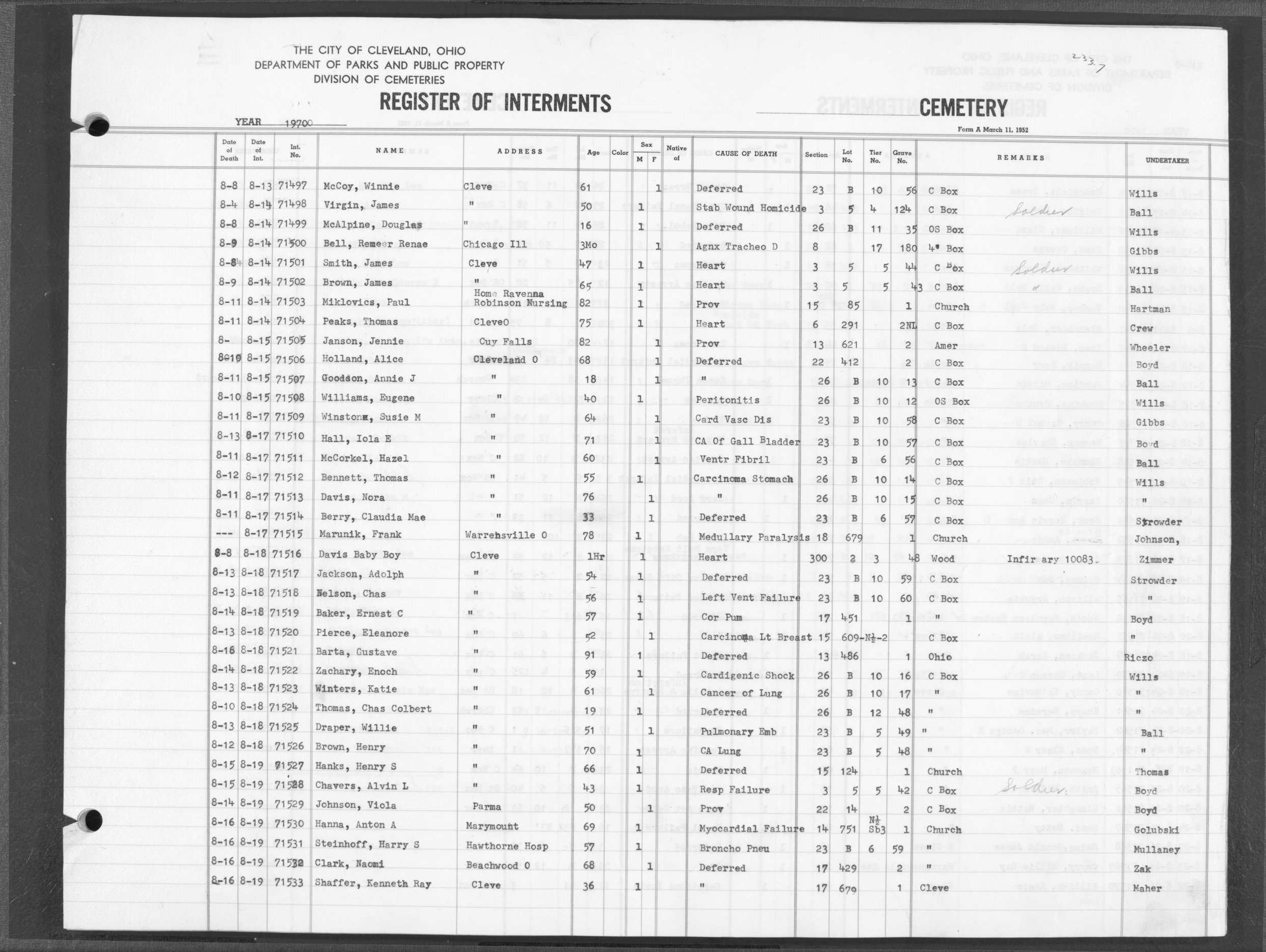| Highland Park | 7 | 96 | Aug | 16 | 1968 | Aug | 24 | 1968 | 66782 | Payne, Bessie | 81y | F | ||