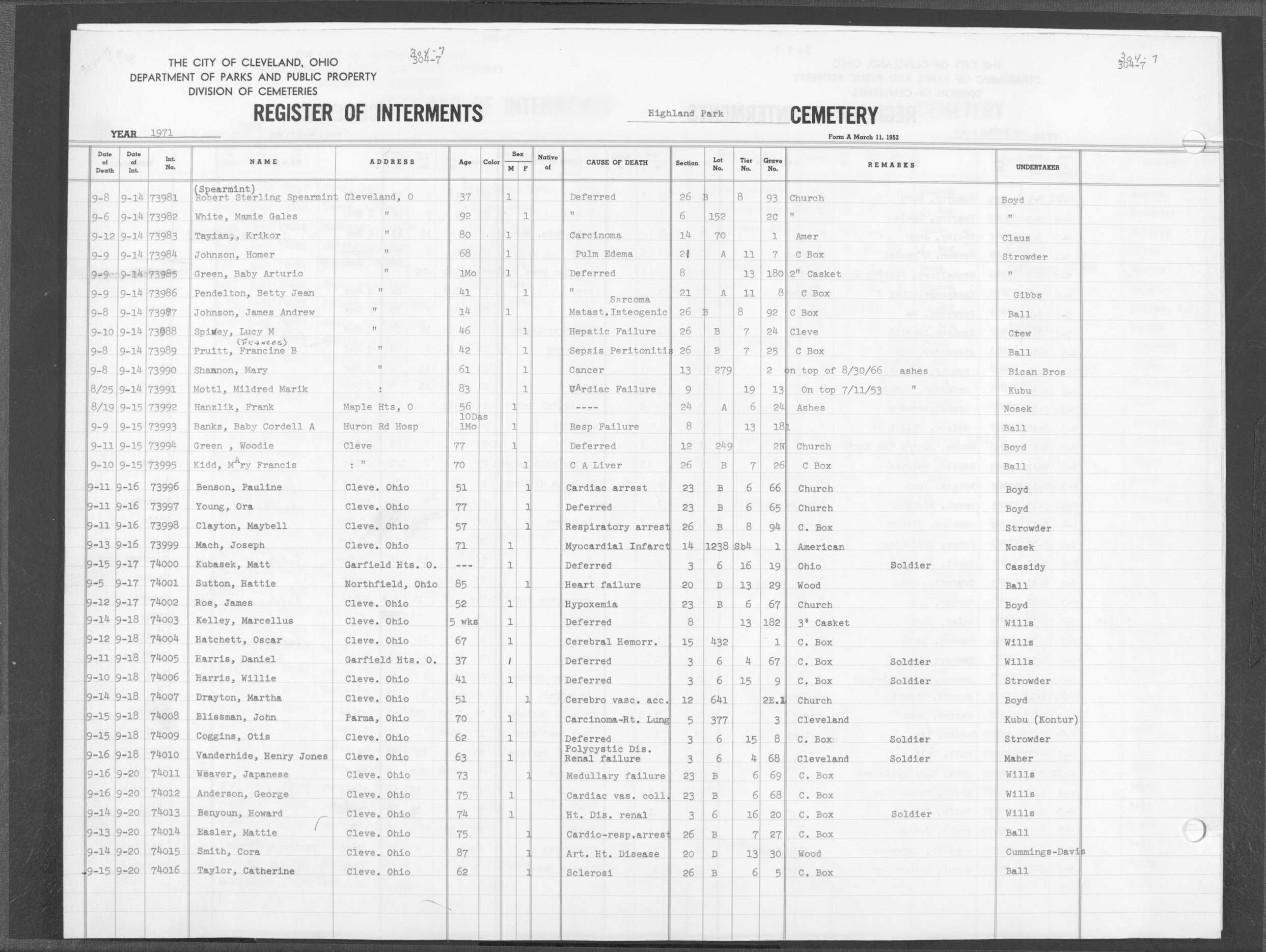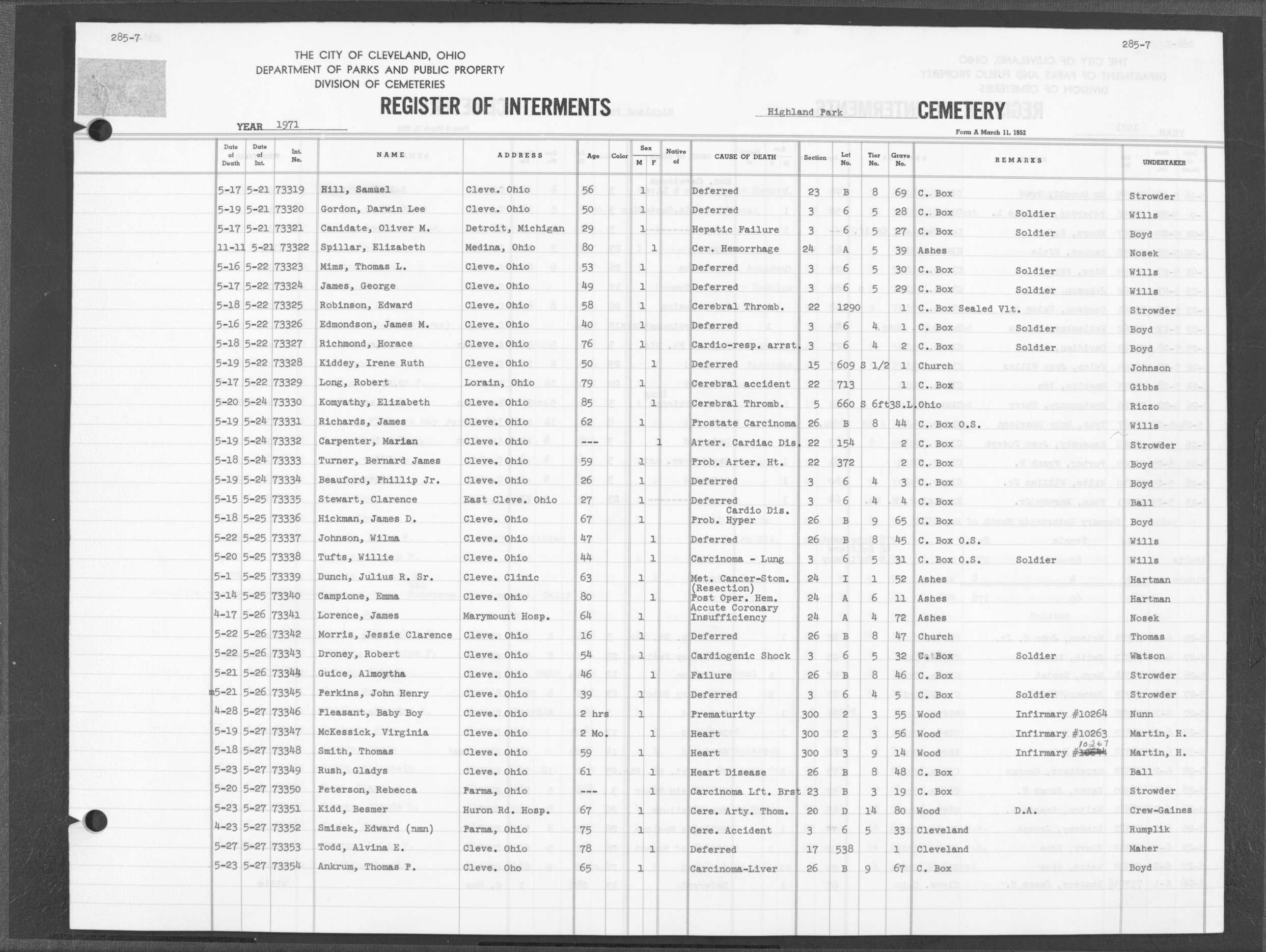 | Highland Park | 7 | 331 | Jan | 30 | 1972 | Feb | 5 | 1972 | 74926 | Perkins, Mary Frances | 58y | F | ||