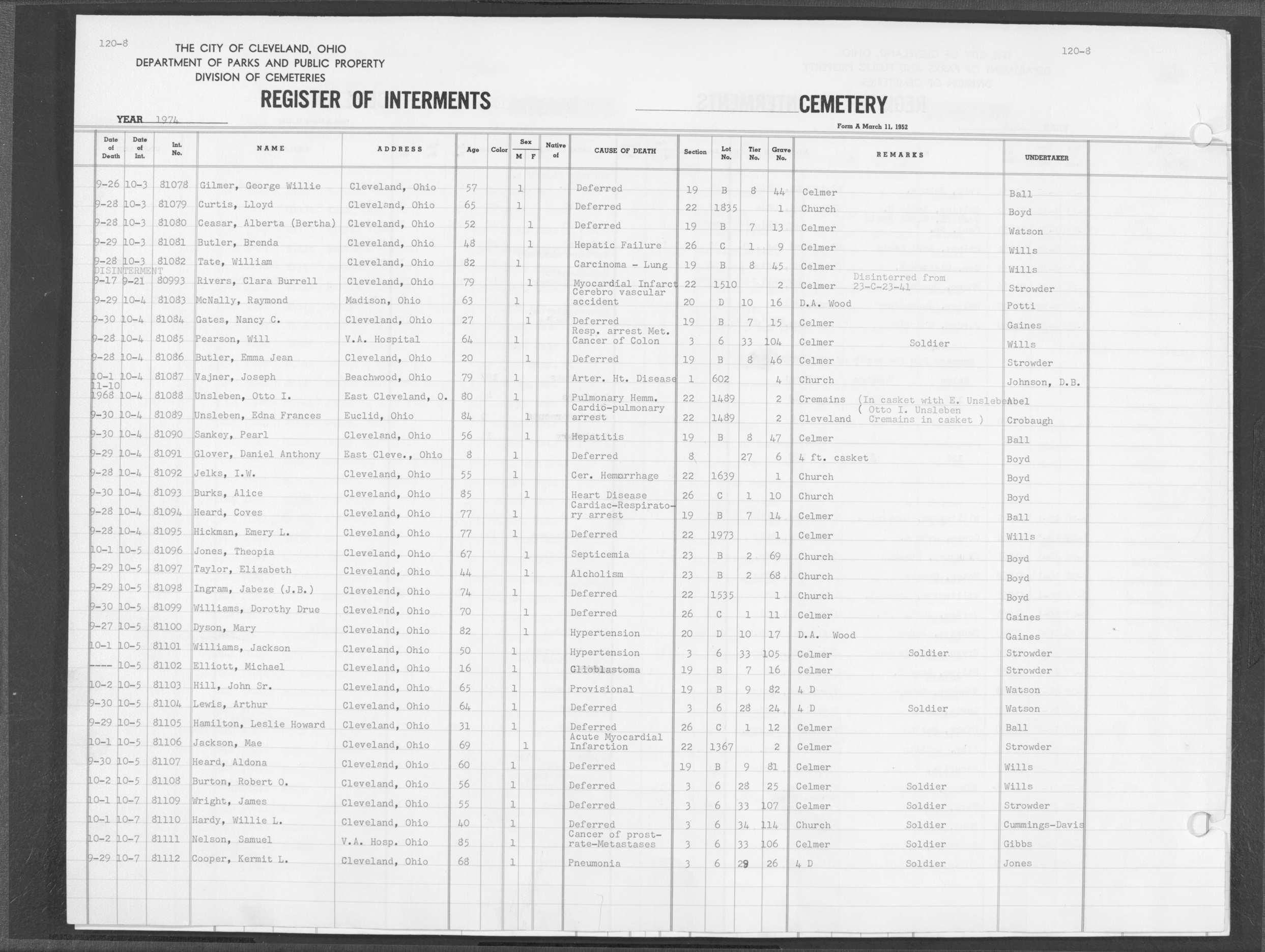 | Highland Park | 8 | 374 | Aug | 4 | 1978 | Aug | 7 | 1978 | 90761 | Payne, Albert Noah | 61y | M | ||