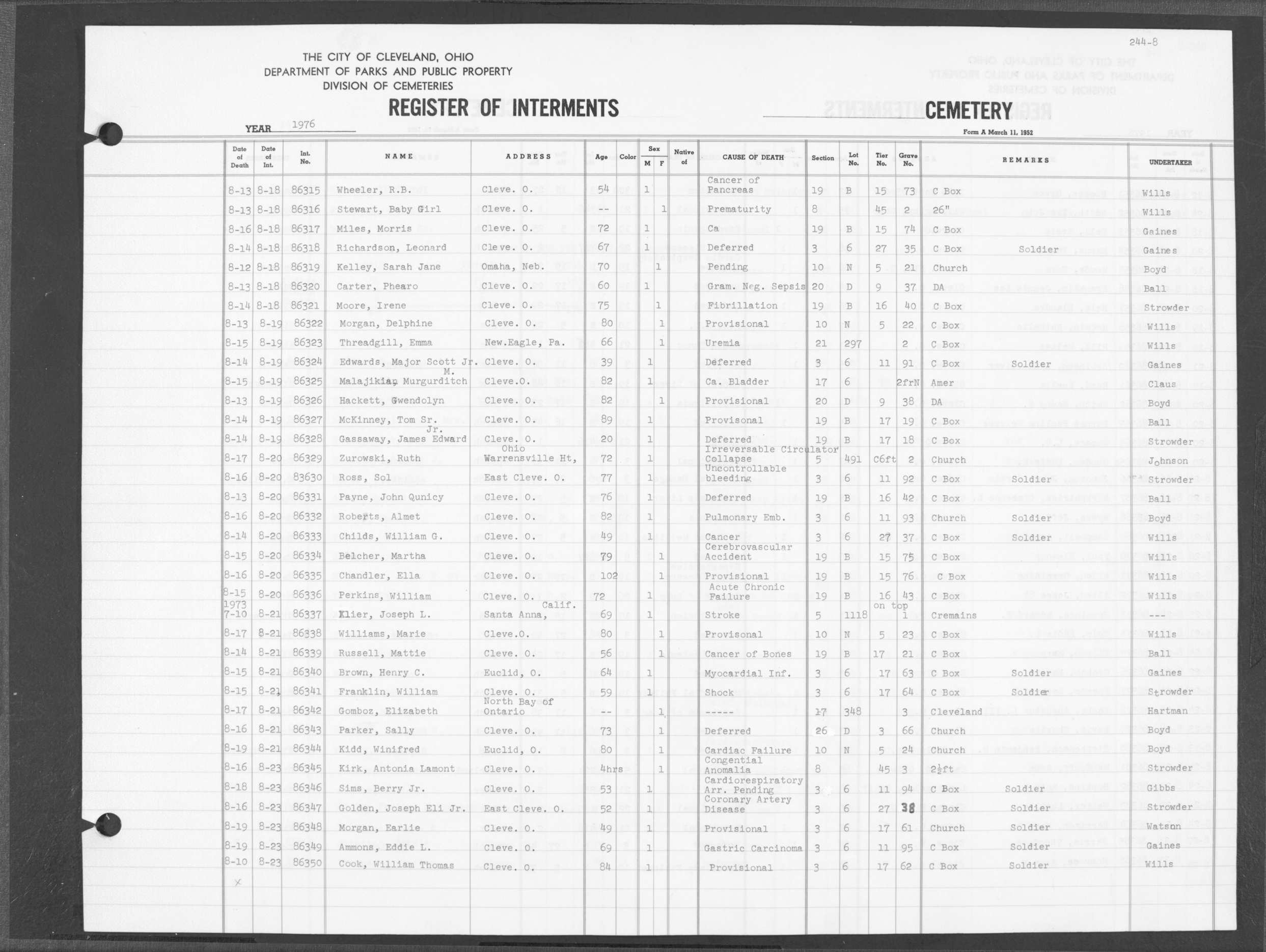 | Highland Park | 8 | 244 | Aug | 15 | 1976 | Aug | 20 | 1976 | 86336 | Perkins, William | 72y | M | ||