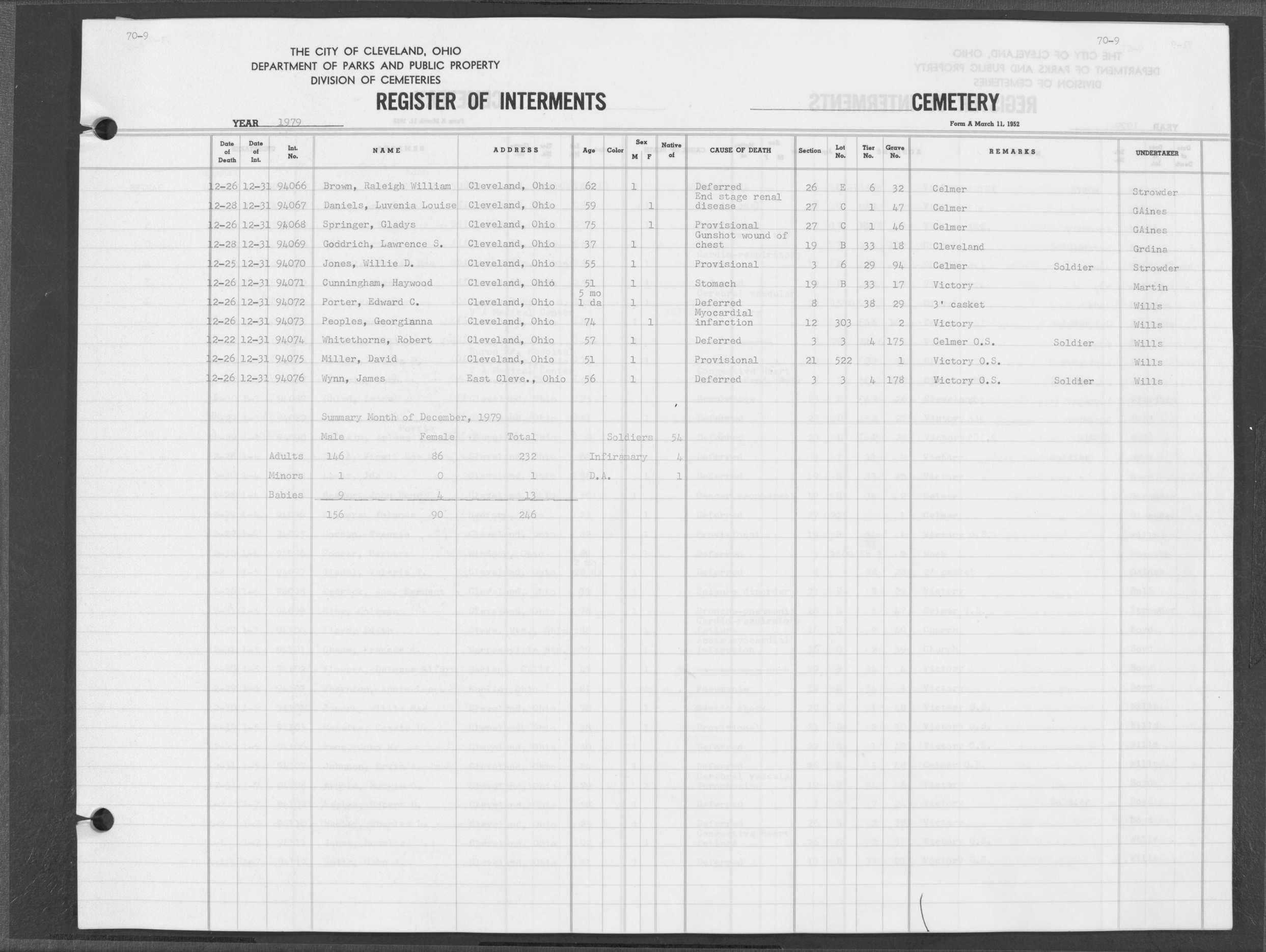 | Highland Park | 6 | 156 | Dec | 22 | 1961 | Dec | 26 | 1961 | 53986 | Perkins, Obert L | 56y | M | ||