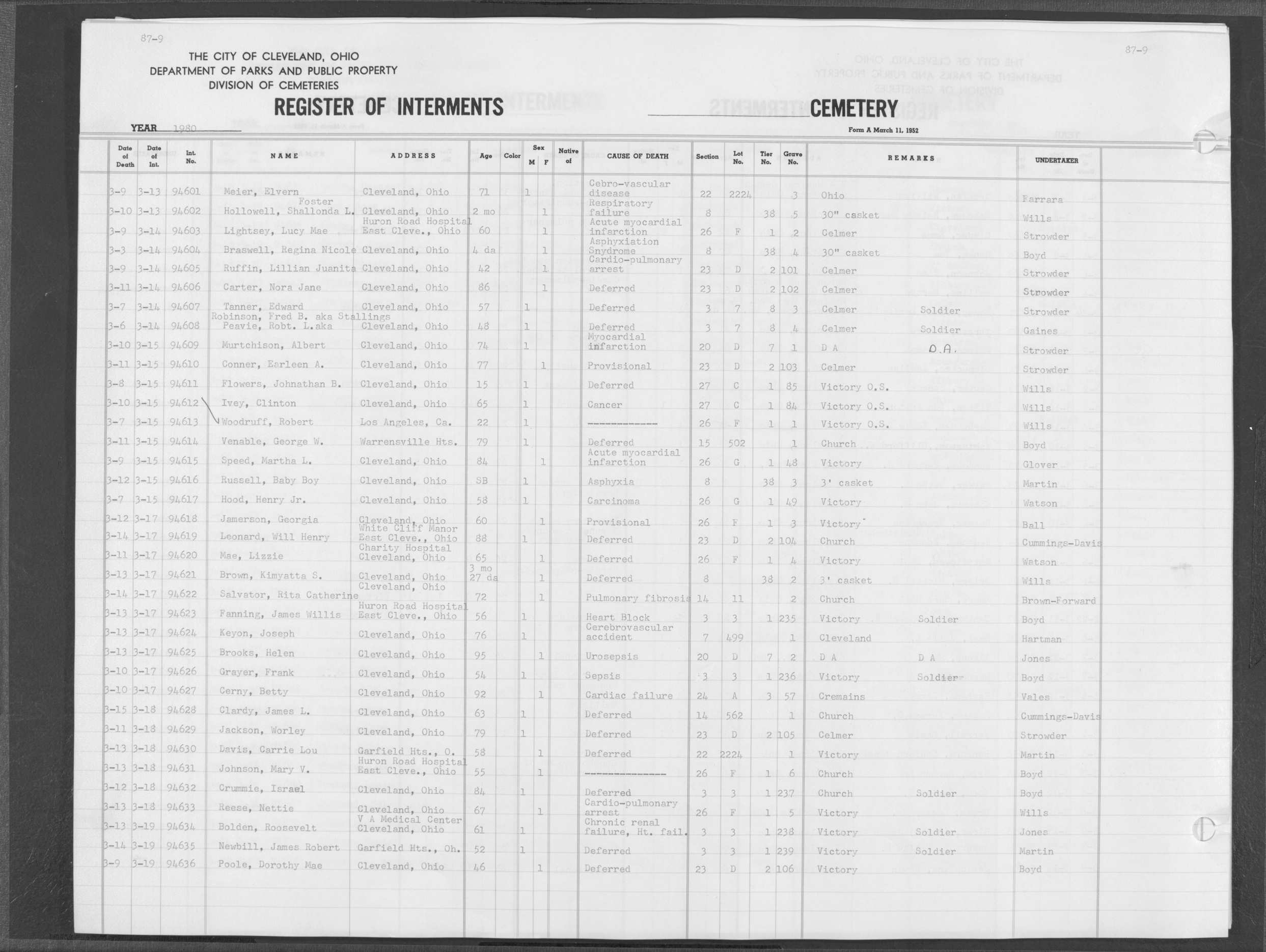 | West Park | 6 | 193 | Mar | 27 | 1992 | Mar | 30 | 1992 | 45099 | Payne, Elmer A | Sr | 83y | M | |