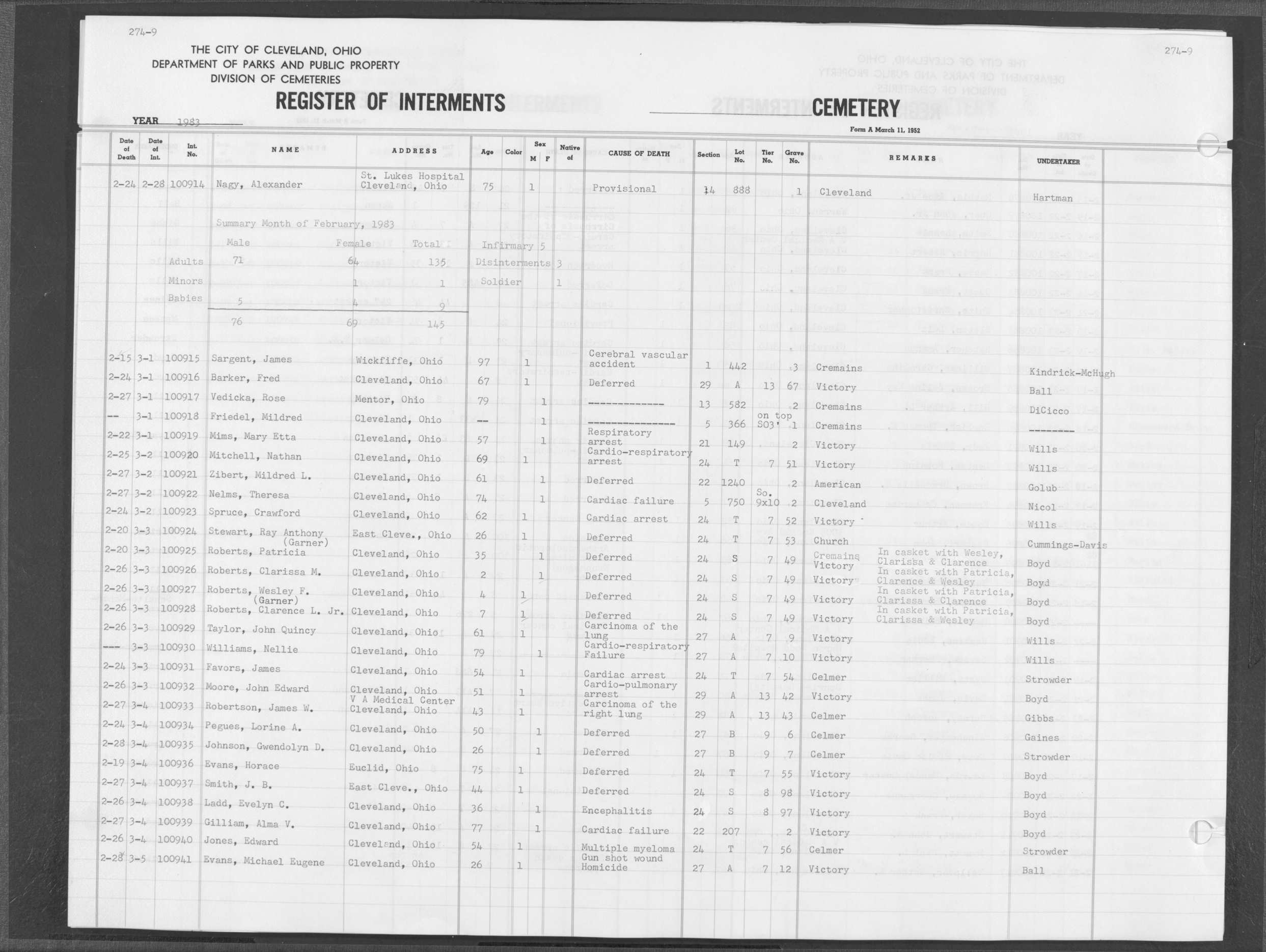| Highland Park | 9 | 289 | Jun | 2 | 1983 | Jun | 6 | 1983 | 101426 | Perkins, Norman | 76y | M | ||
