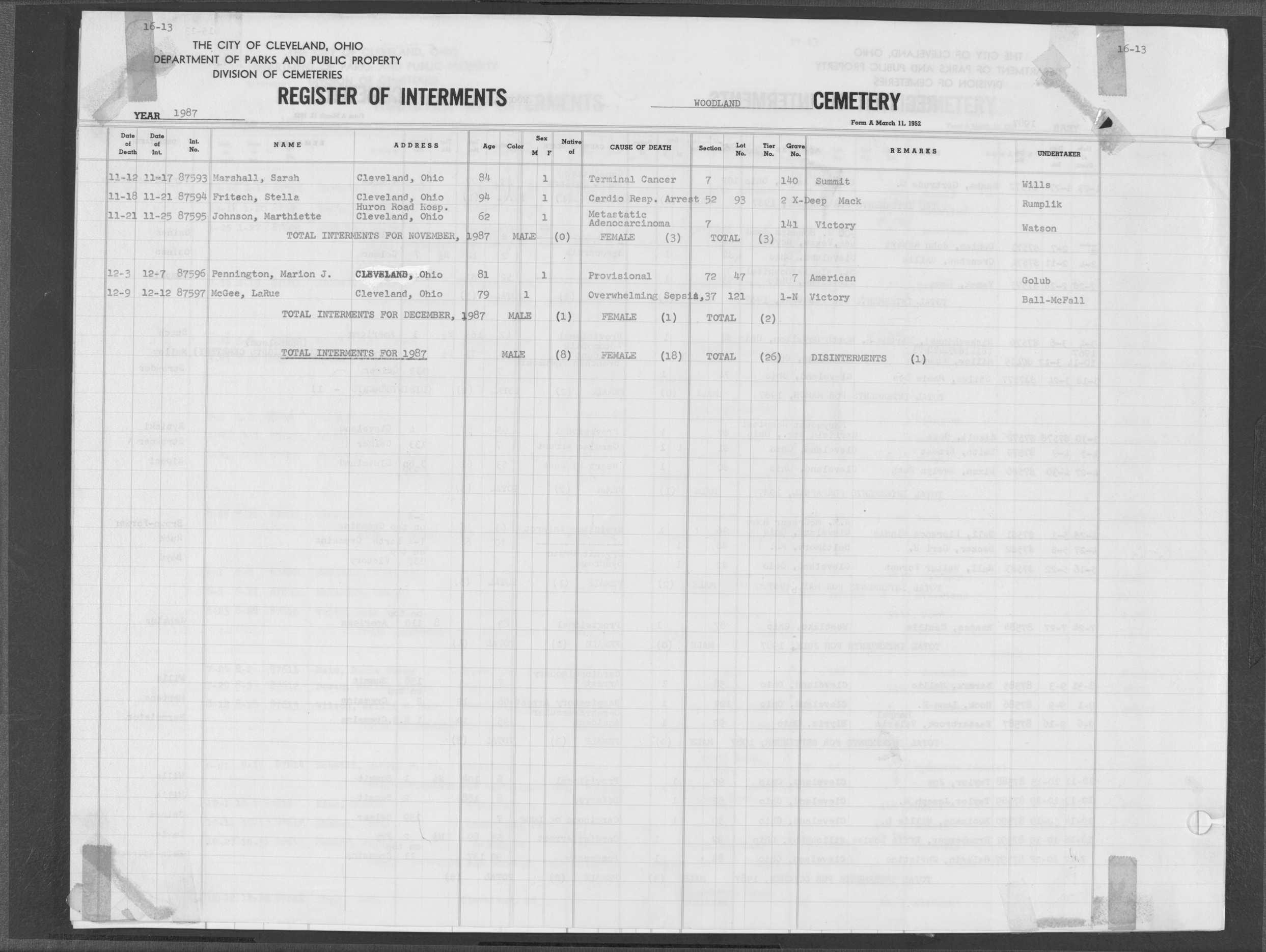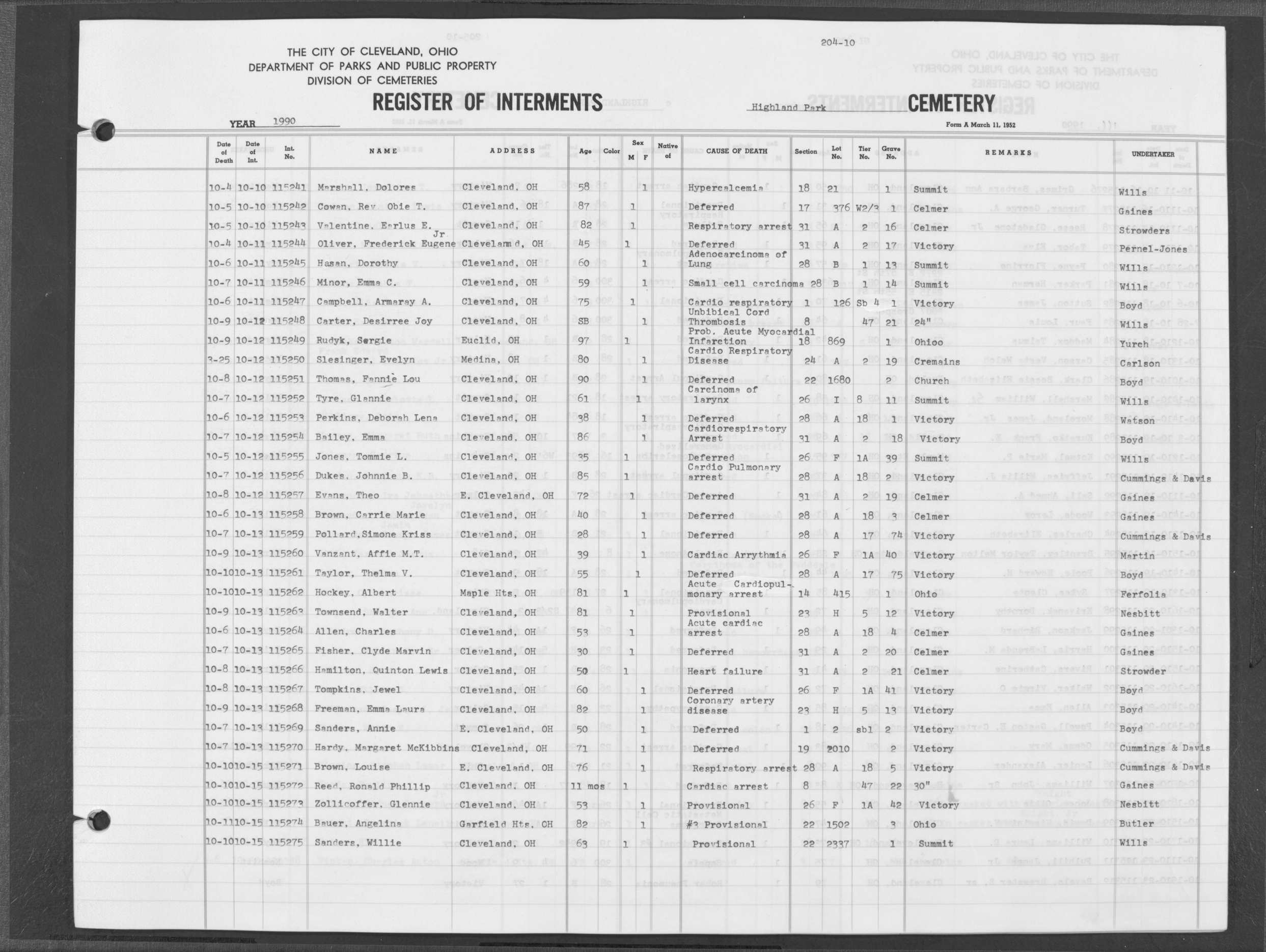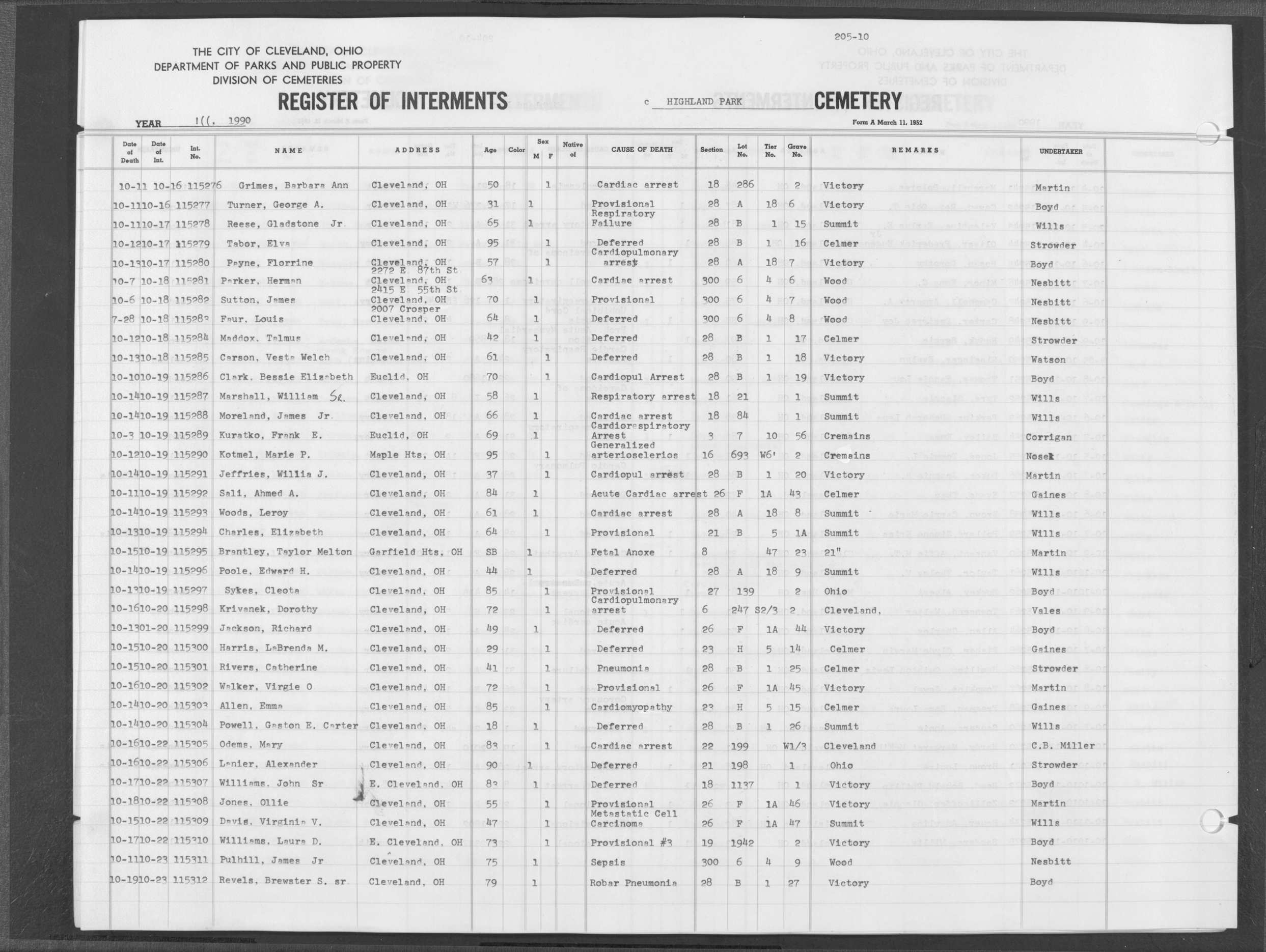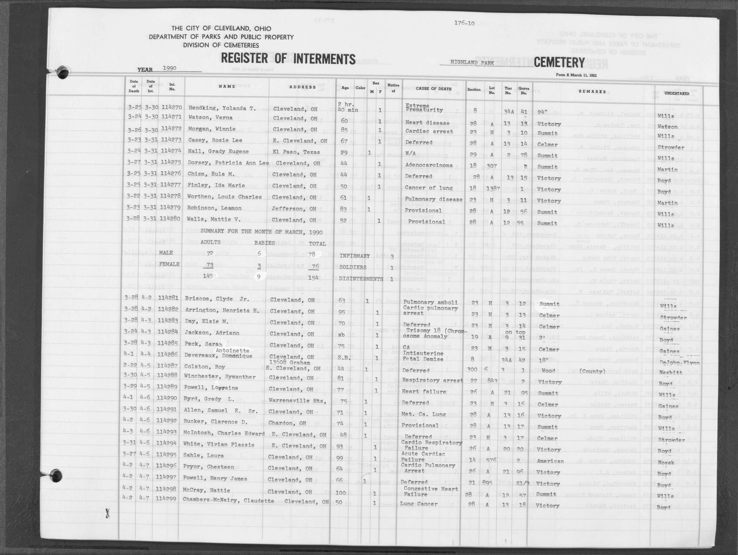 | Highland Park | 10 | 153 | Oct | 31 | 1989 | Nov | 2 | 1989 | 113508 | Perkins, Rena I | 87y | F | ||
