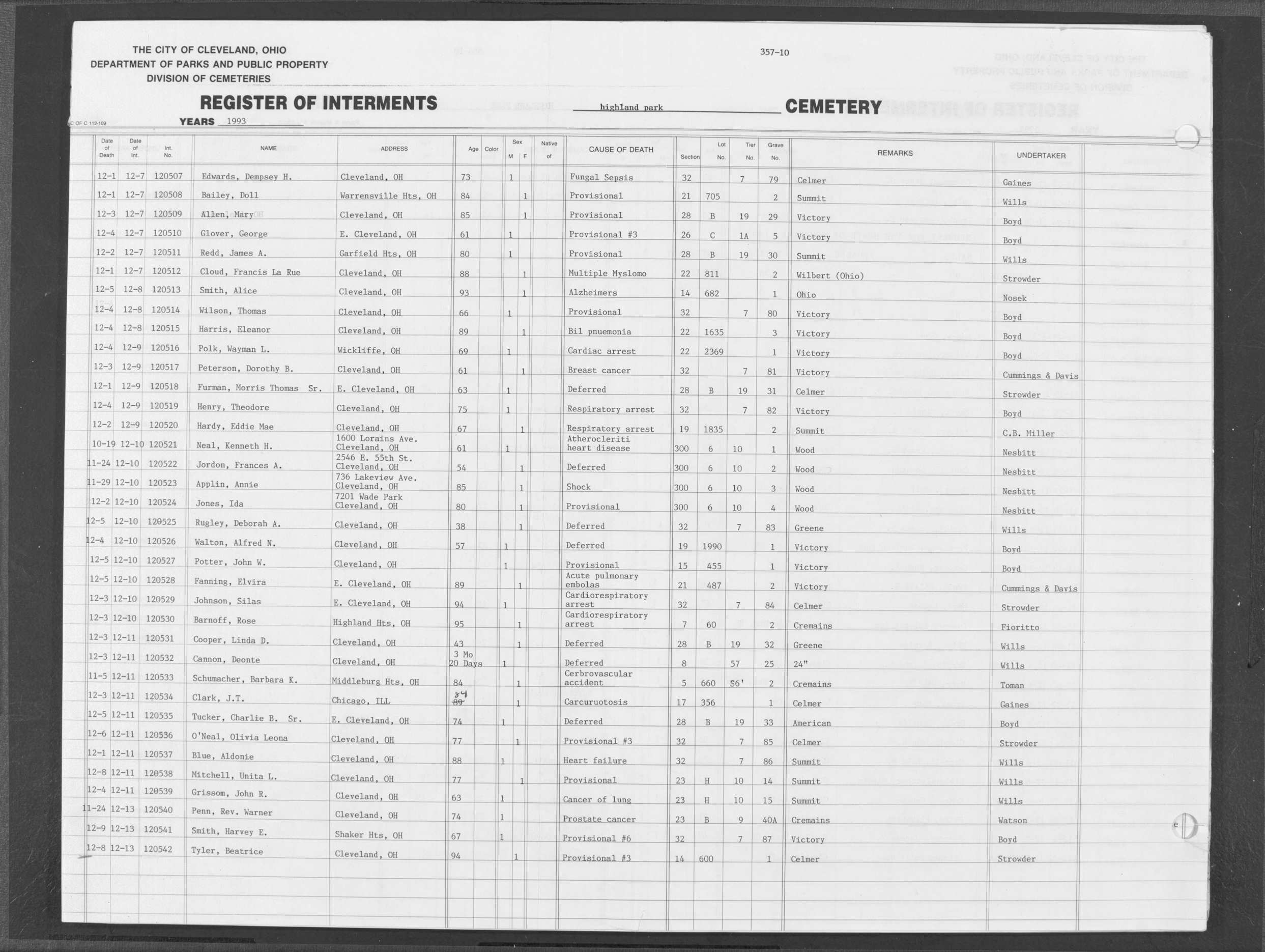 | Highland Park | 10 | 331 | May | 23 | 1993 | May | 28 | 1993 | 119615 | Perkins, Van | 85y | M | ||