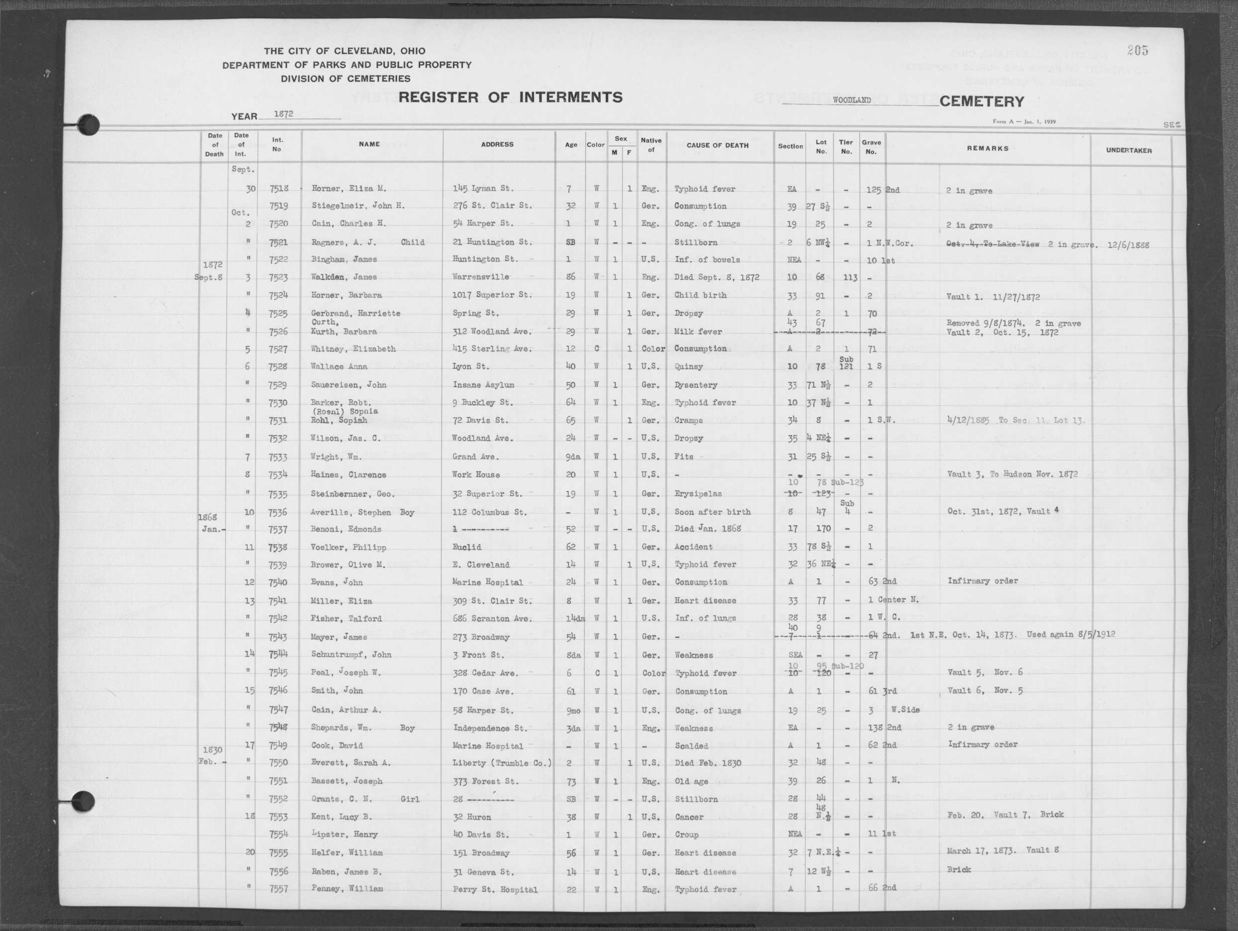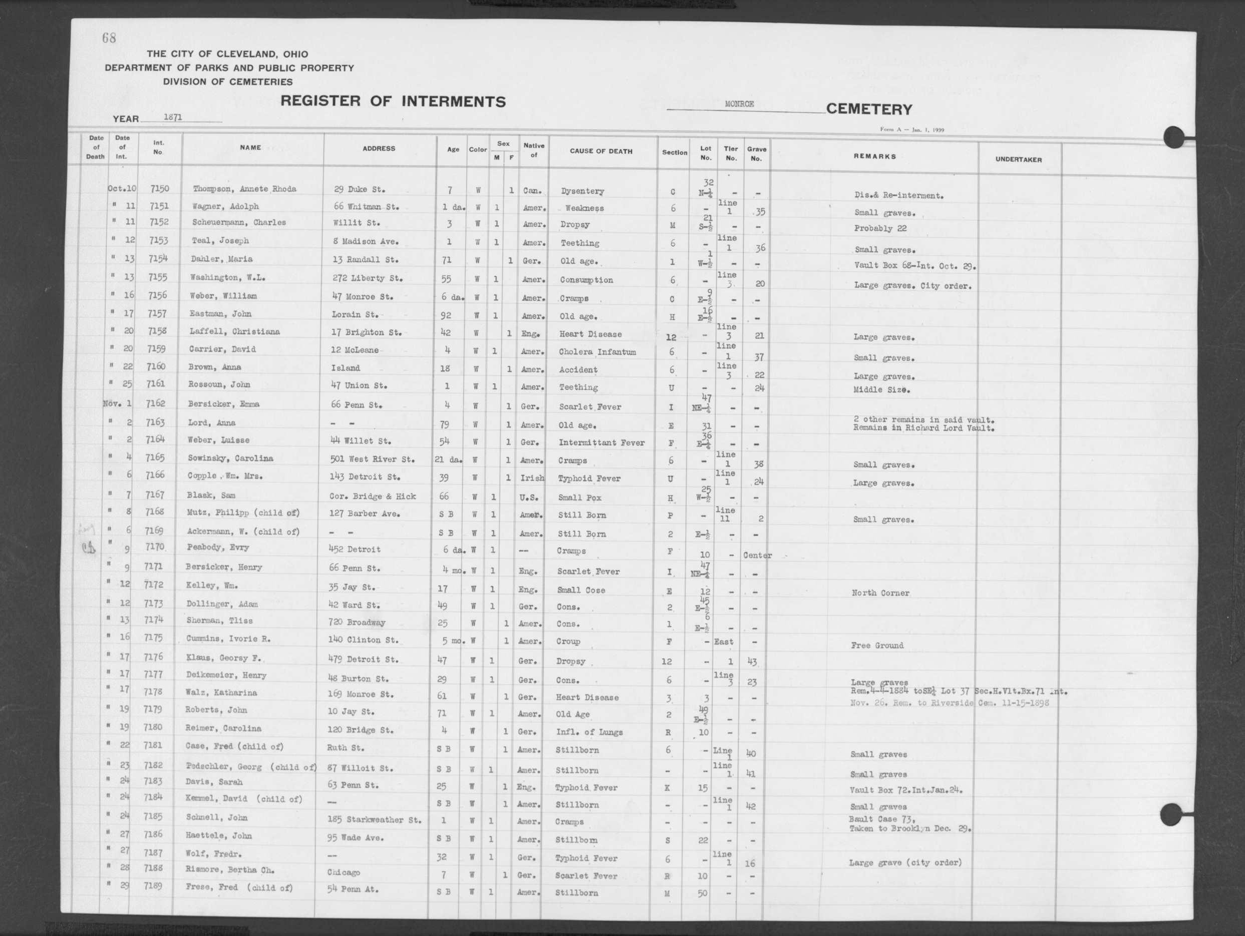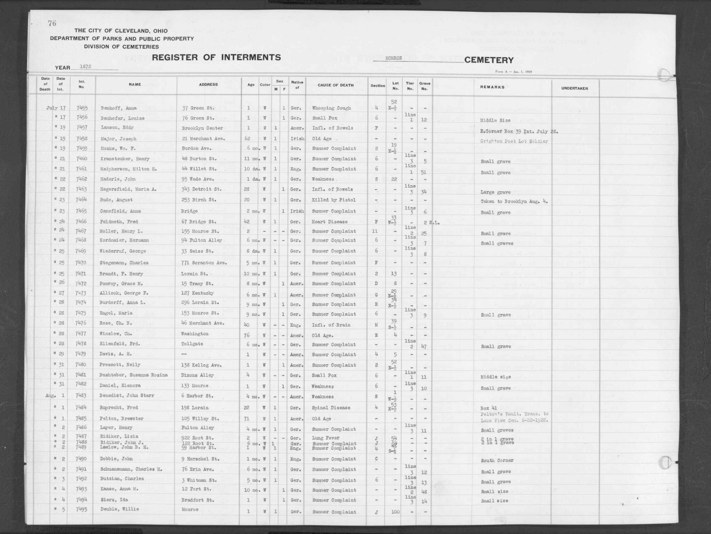 | Monroe Street | 1 | 79 | Oct | 12 | 1872 | 7615 | Pay, Margret | 57y | W | |||||