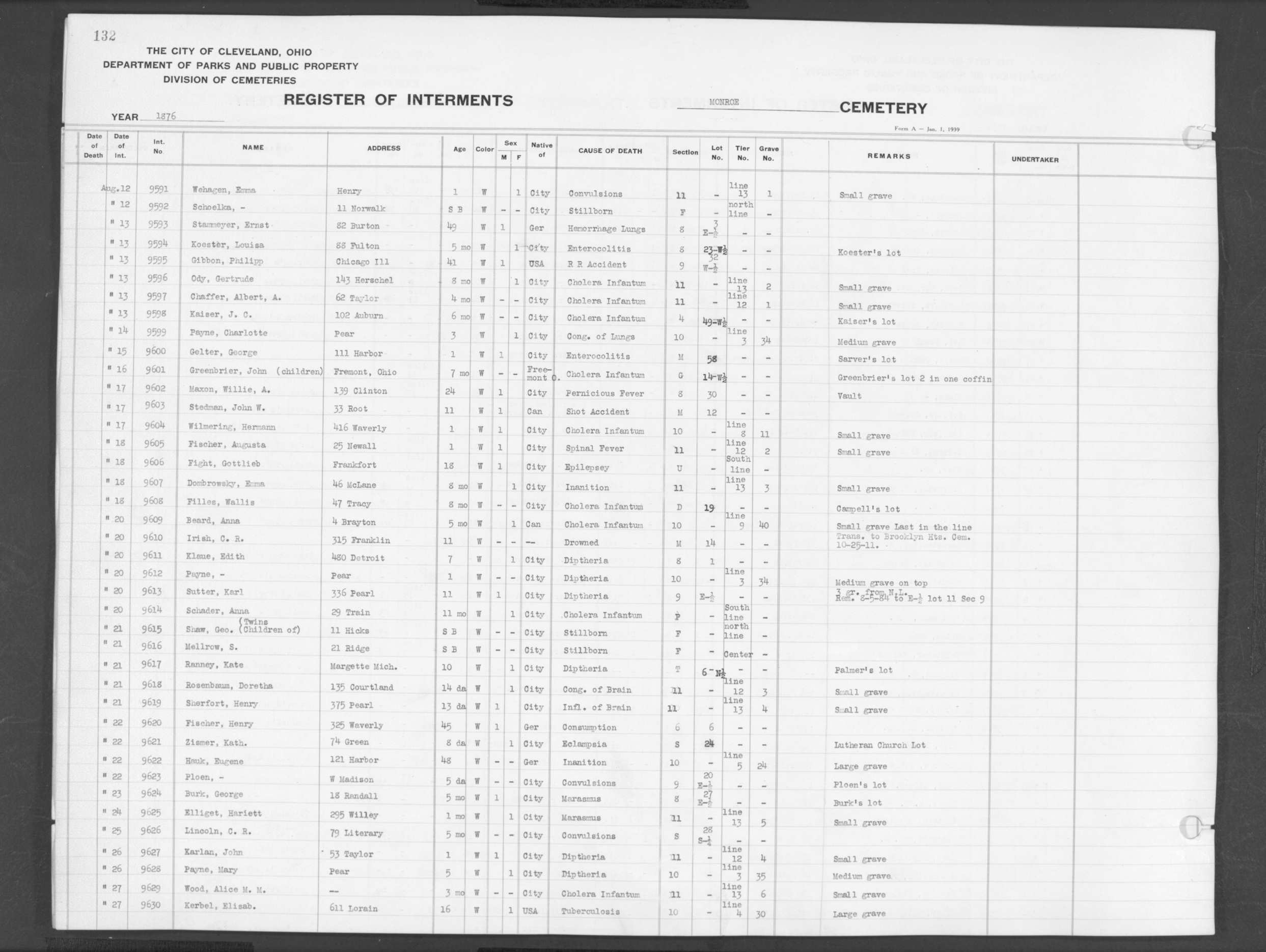 | Monroe Street | 1 | 132 | Aug | 14 | 1876 | 9599 | Payne, Charlotte | 3m | W | F | ||||