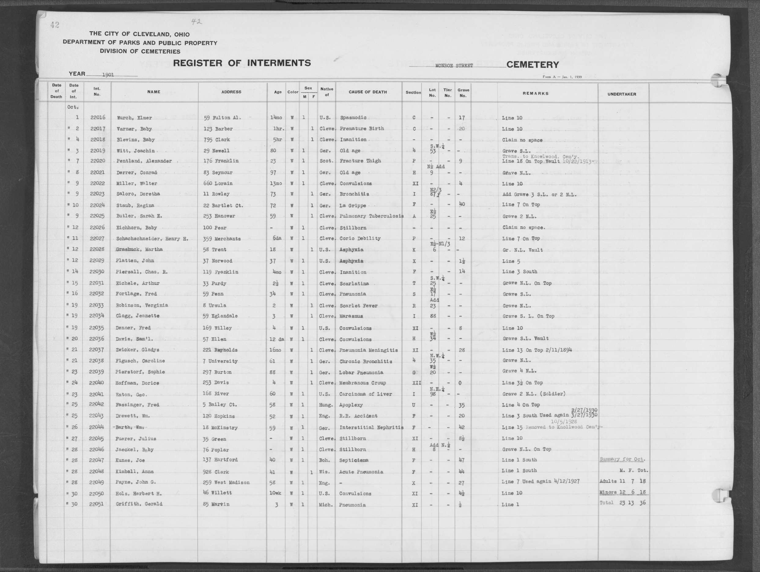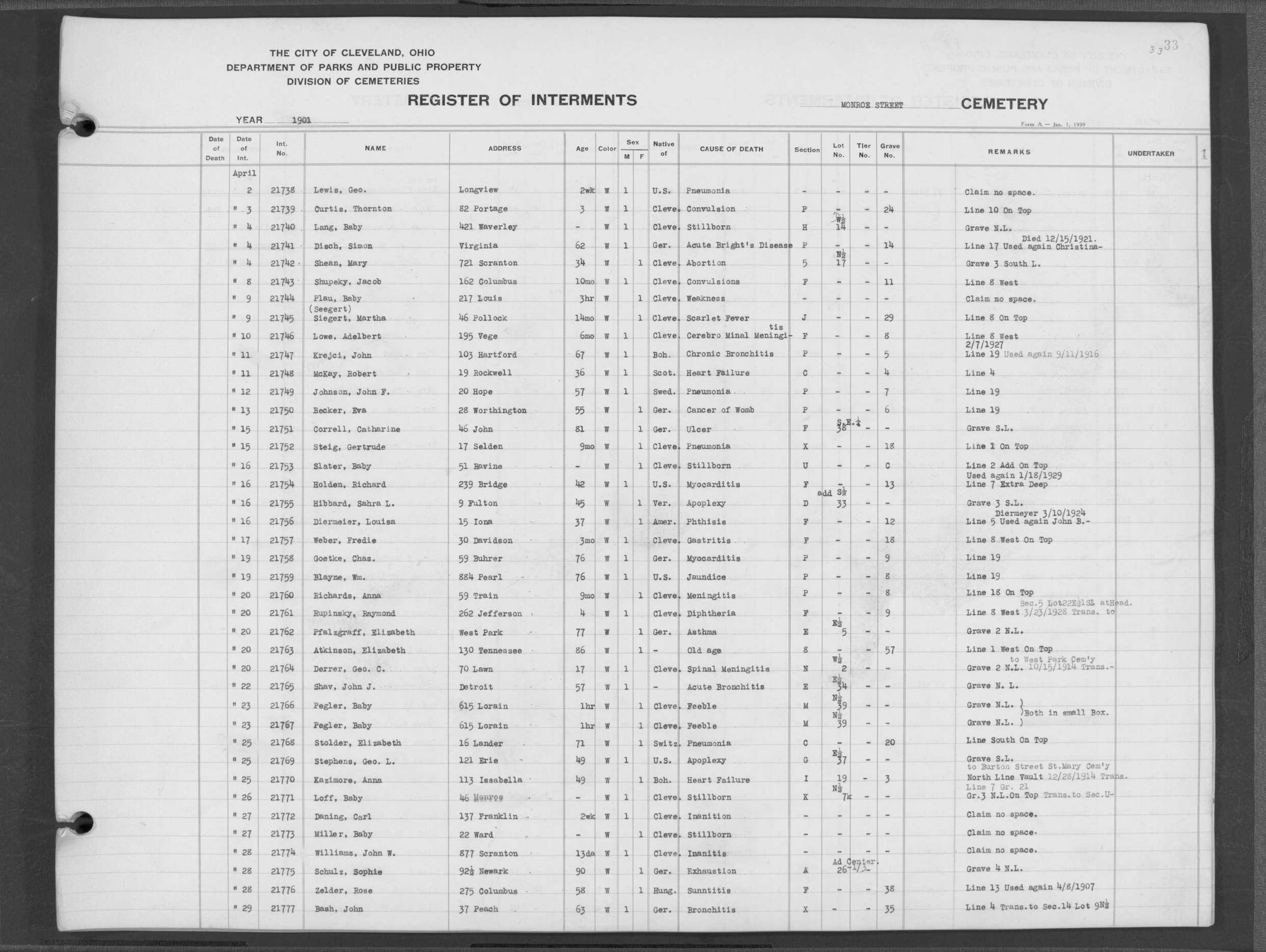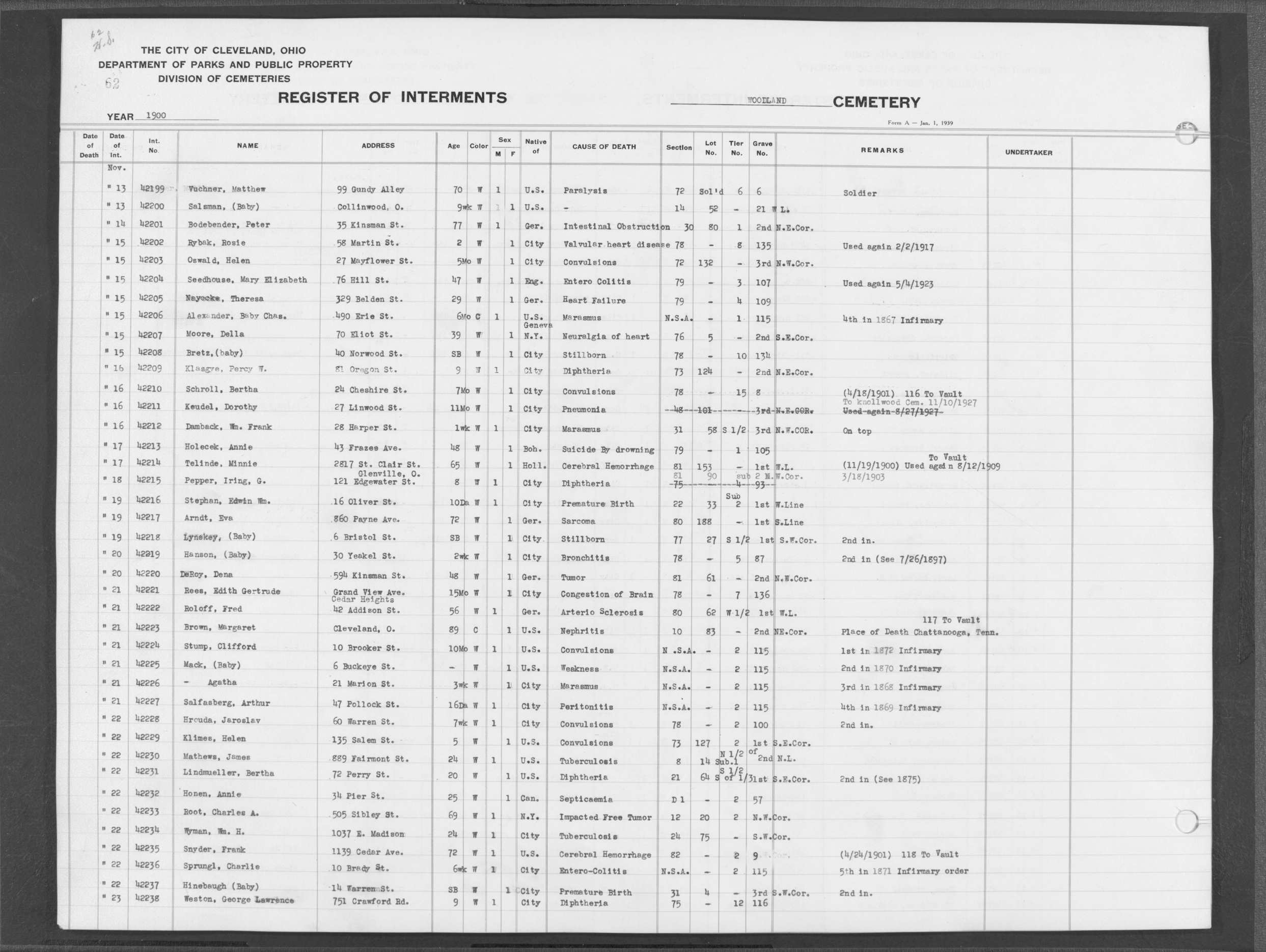 | Monroe Street | 3 | 12 | Nov | 14 | 1899 | 21016 | Payne, Edgar L | 1y | W | M | ||||