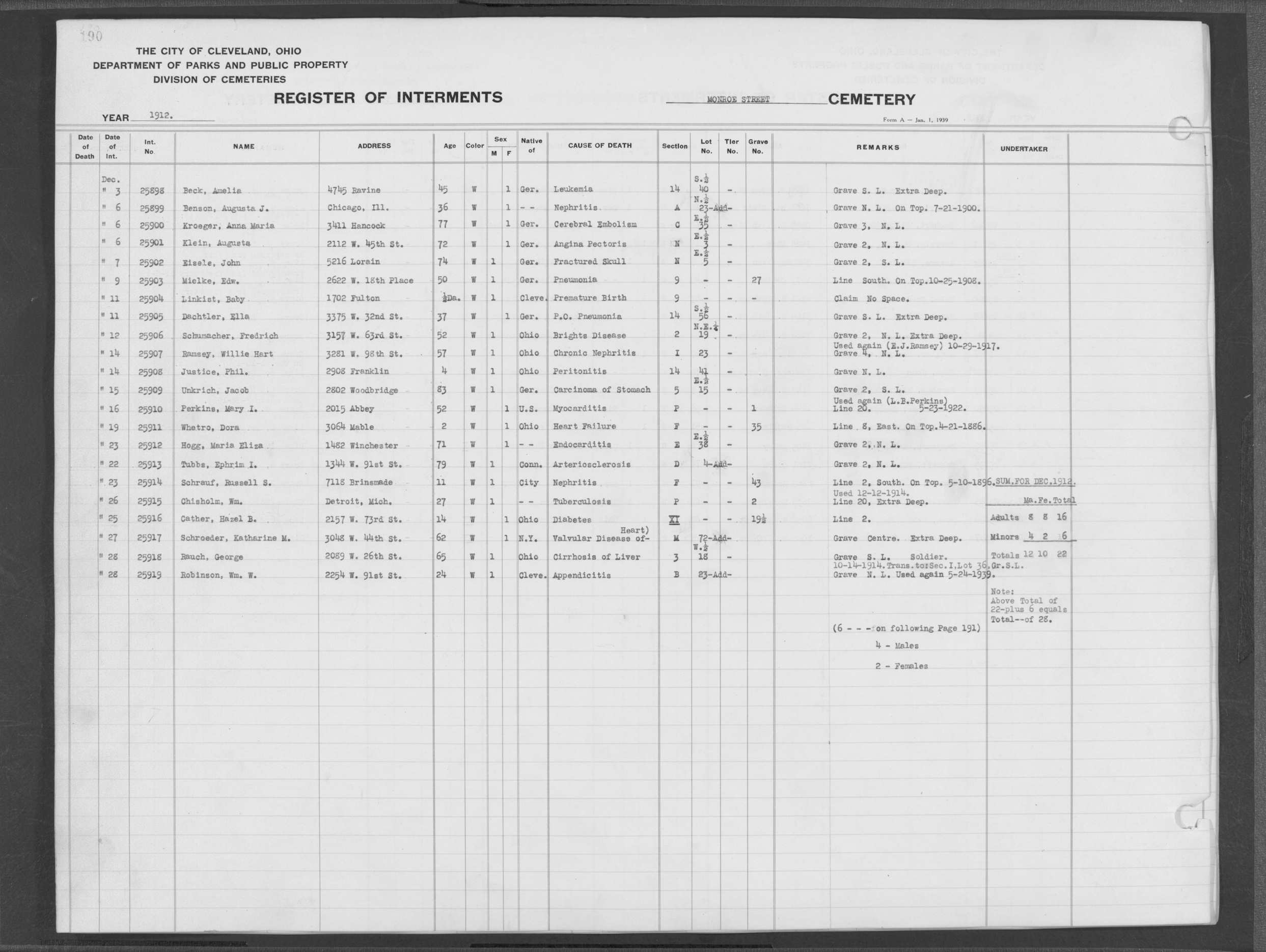 | Monroe Street | 3 | 190 | Dec | 16 | 1912 | 25910 | Perkins, Mary I | 52y | W | F | ||||