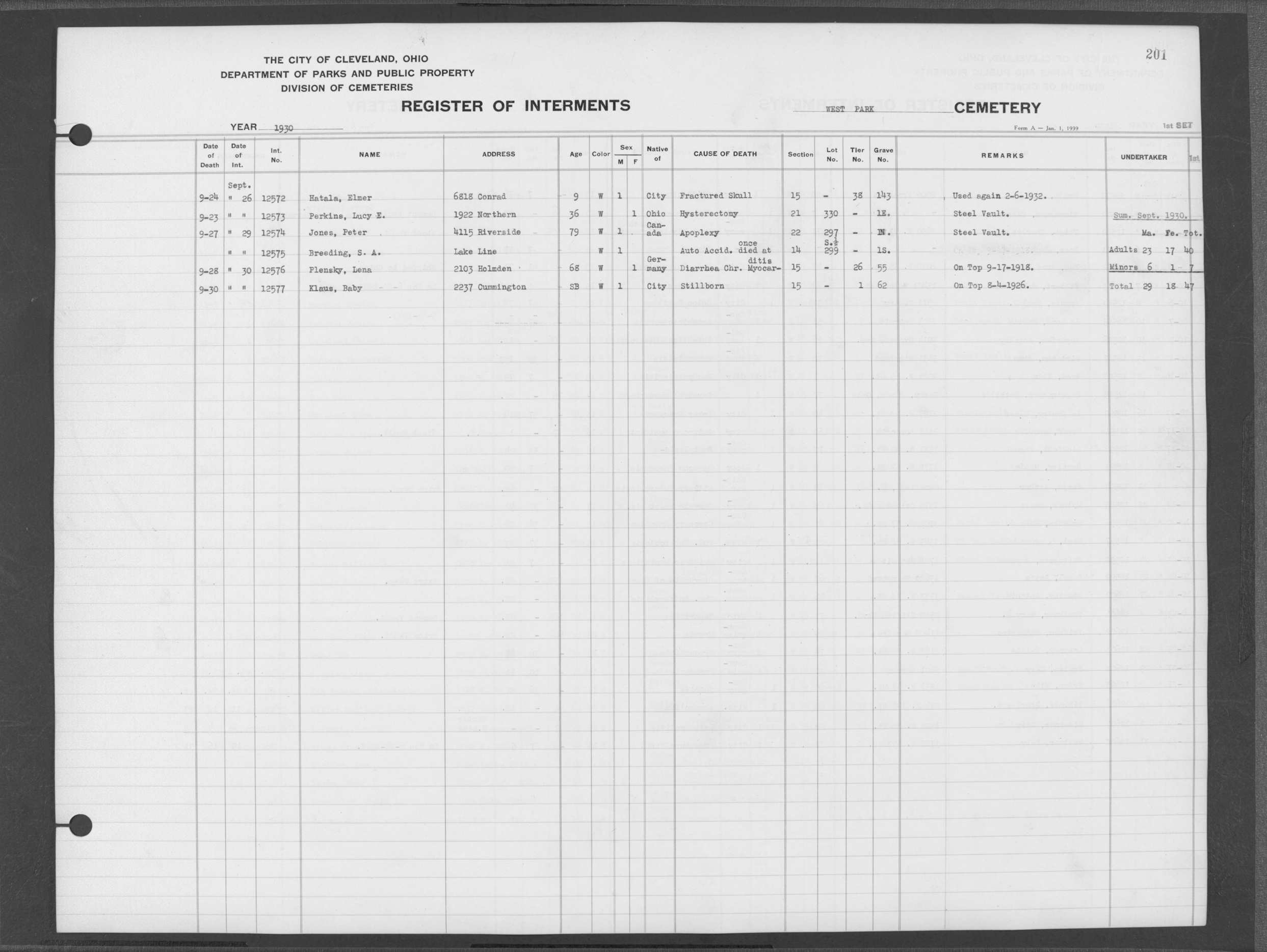 | West Park | 2 | 201 | Sep | 23 | 1930 | Sep | 26 | 1930 | 12573 | Perkins, Lucy E | 36y | W | F | |