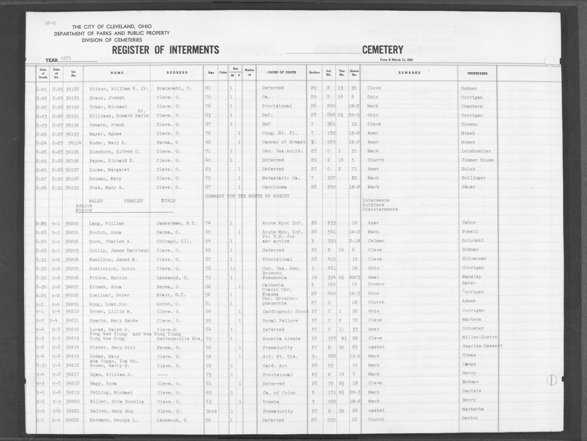 | Highland Park | 8 | 177 | Aug | 18 | 1975 | Aug | 21 | 1975 | 83061 | Perkins, Mary | 75y | F | ||