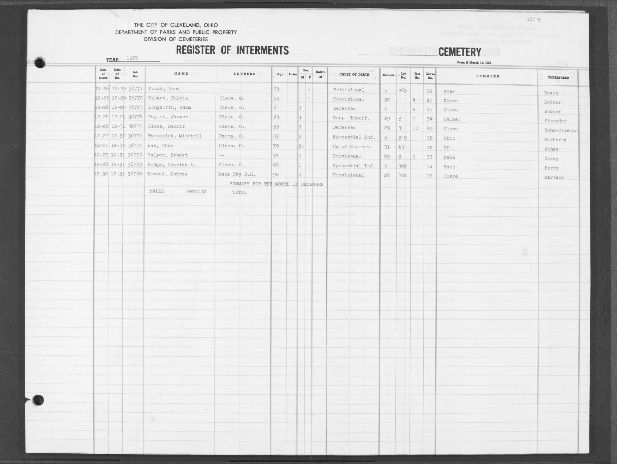 | Highland Park | 5 | 35 | Dec | 6 | 1947 | Dec | 22 | 1947 | 34260 | Payec, John | or Payac | 73y | W | M |