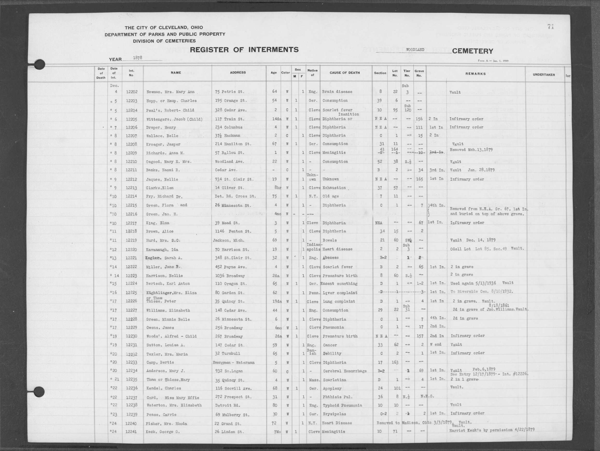 | Erie Street | 2 | 30 | Oct | 27 | 1884 | 14445 | Payne, Almira | 73y | W | F | ||||