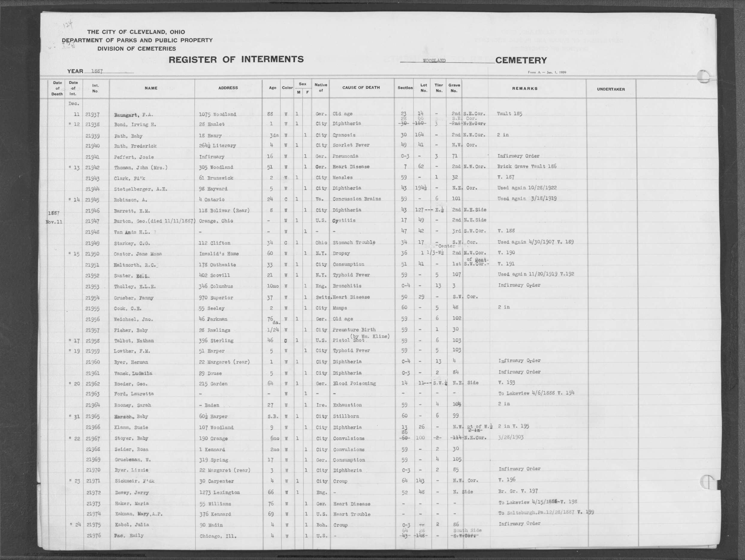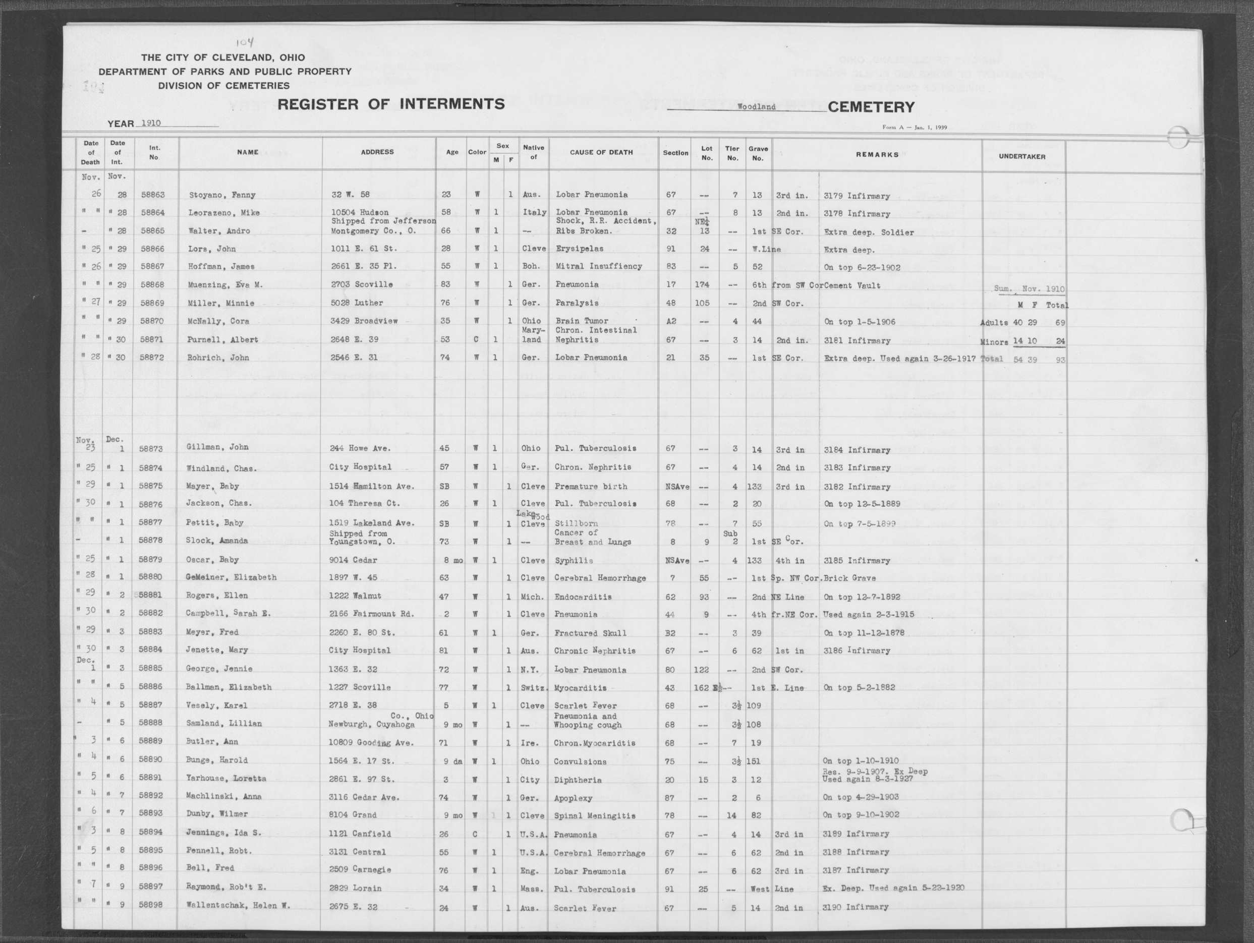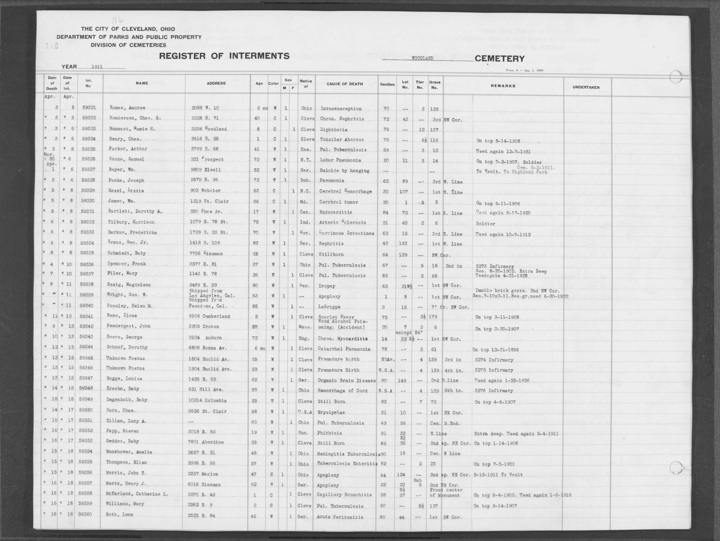 | Woodland | 8 | 131 | Dec | 5 | 1911 | Dec | 9 | 1911 | 59935 | Payer, Emanuel | 62y | W | M | |
