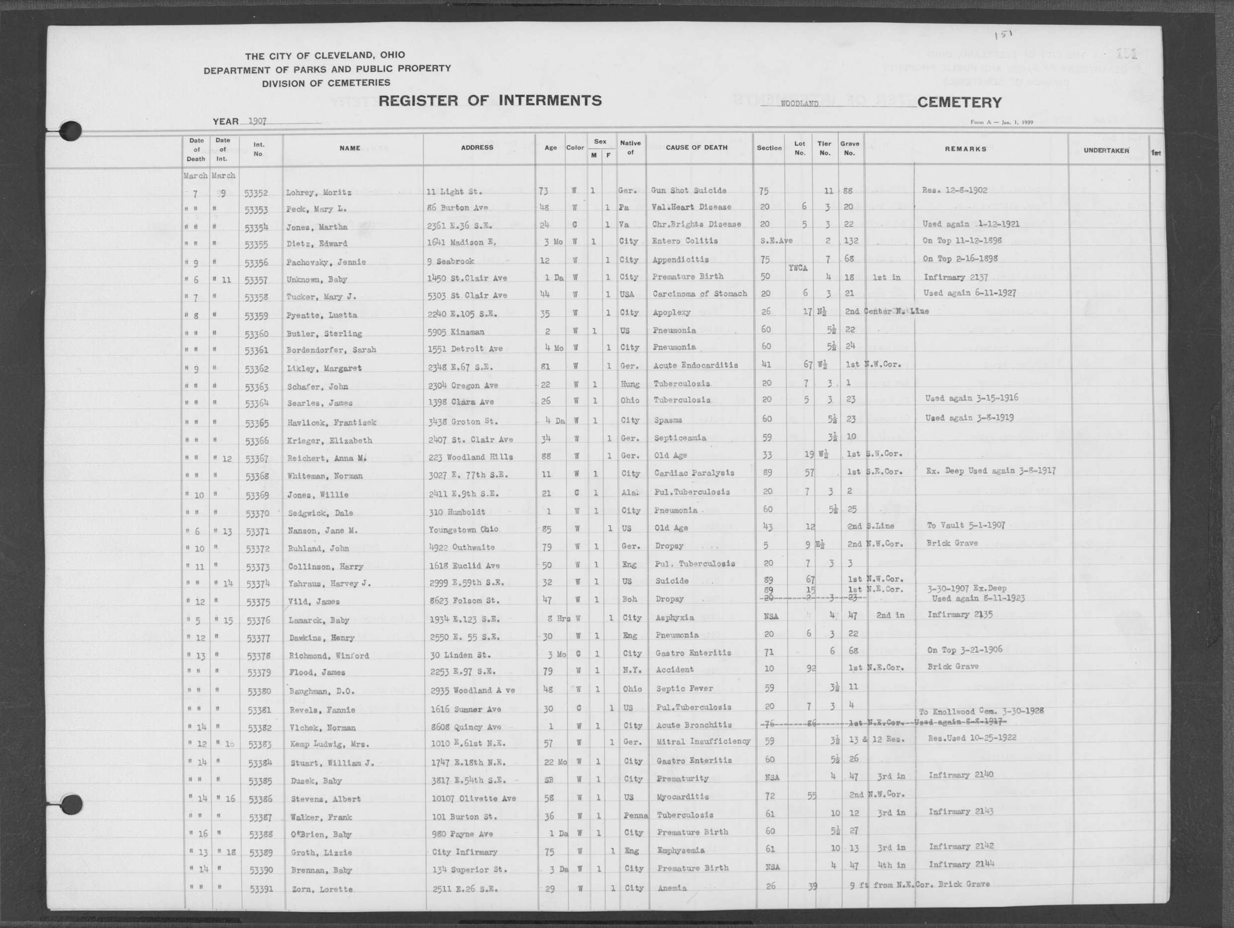 | Woodland | 8 | 11 | Mar | 10 | 1908 | Mar | 13 | 1908 | 55365 | Payer, Theresa | 54y | W | F | |