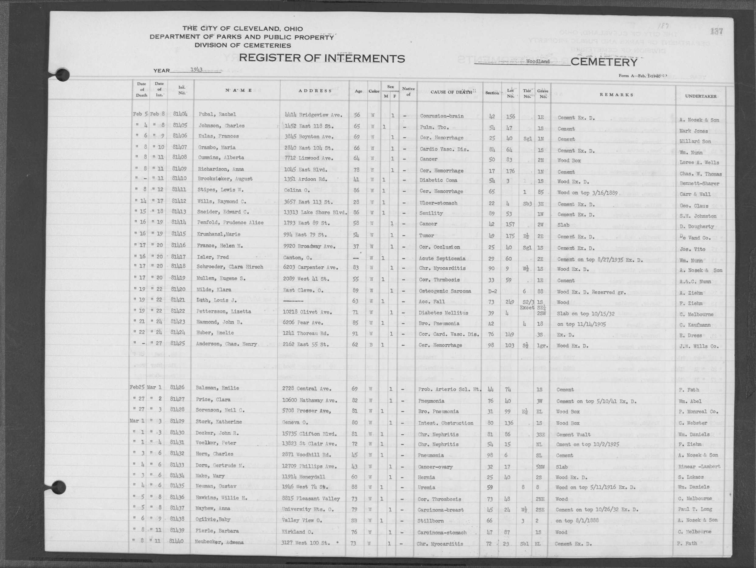 | Highland Park | 4 | 147 | May | 9 | 1943 | May | 13 | 1943 | 28600 | Payer, Elizabeth | 66y | W | F | |
