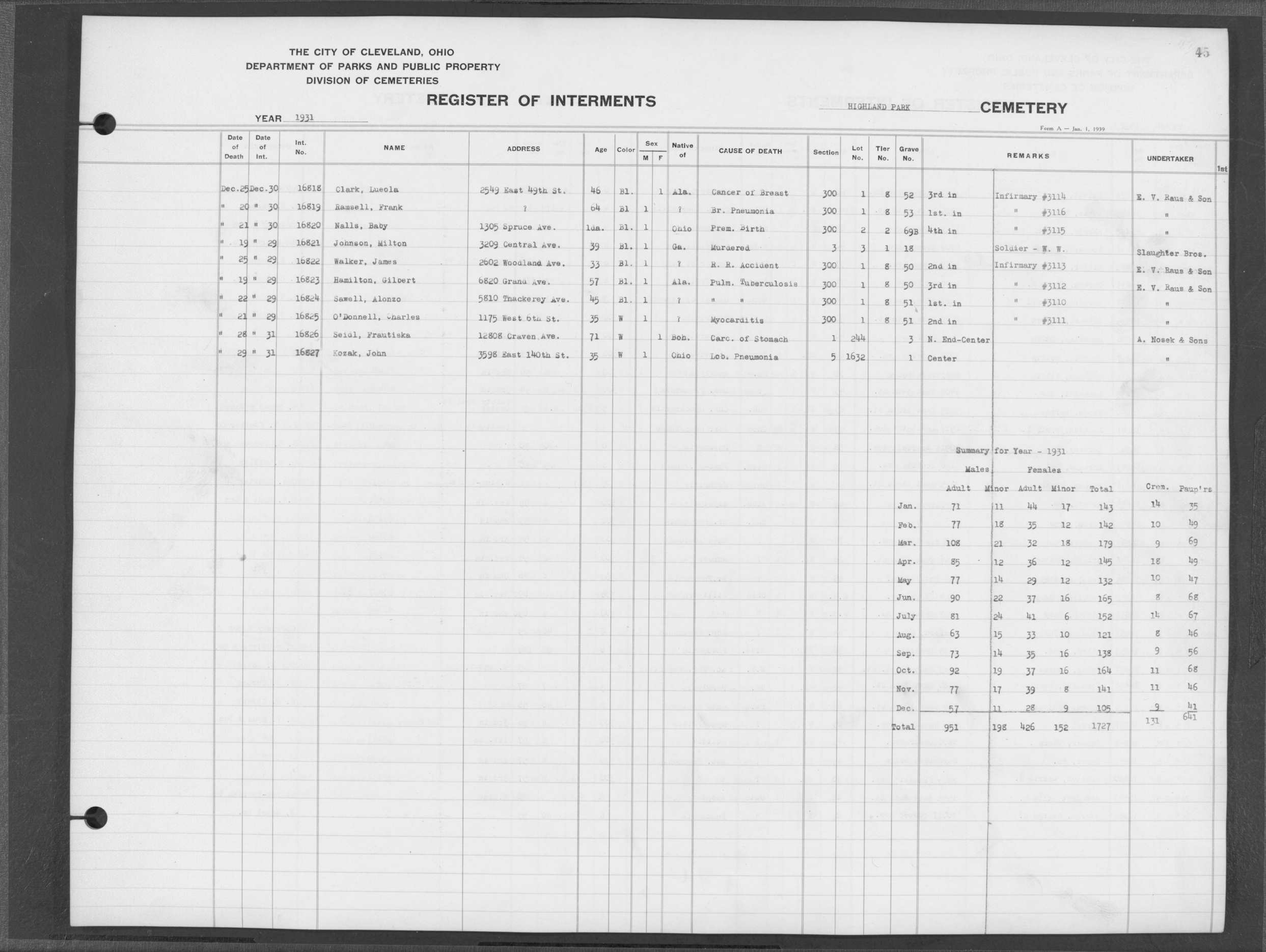 | Highland Park | 4 | 101 | Apr | 18 | 1941 | Apr | 21 | 1941 | 26823 | Raber, Henrietta | 80y | W | F | |