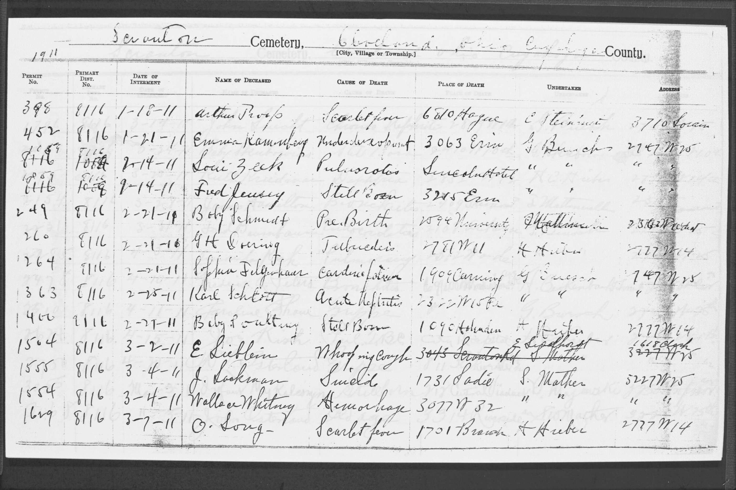 | Scranton Road | 2 | 26 | Jan | 9 | 1914 | Scharf, | Infant | |||||||