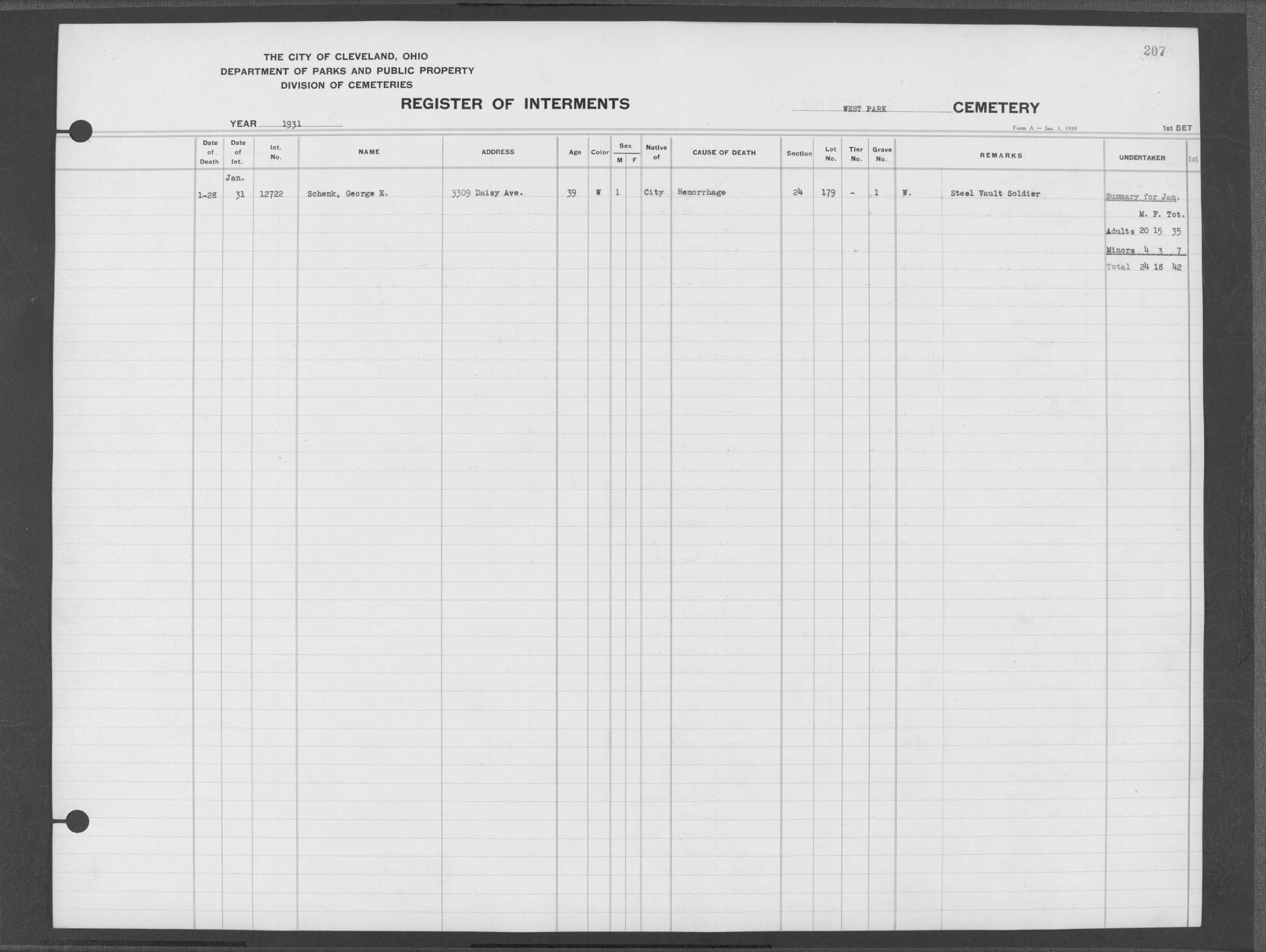 | West Park | 2 | 166 | Feb | 1 | 1929 | Feb | 4 | 1929 | 11662 | Schmenkel, William | 45y | W | M | |