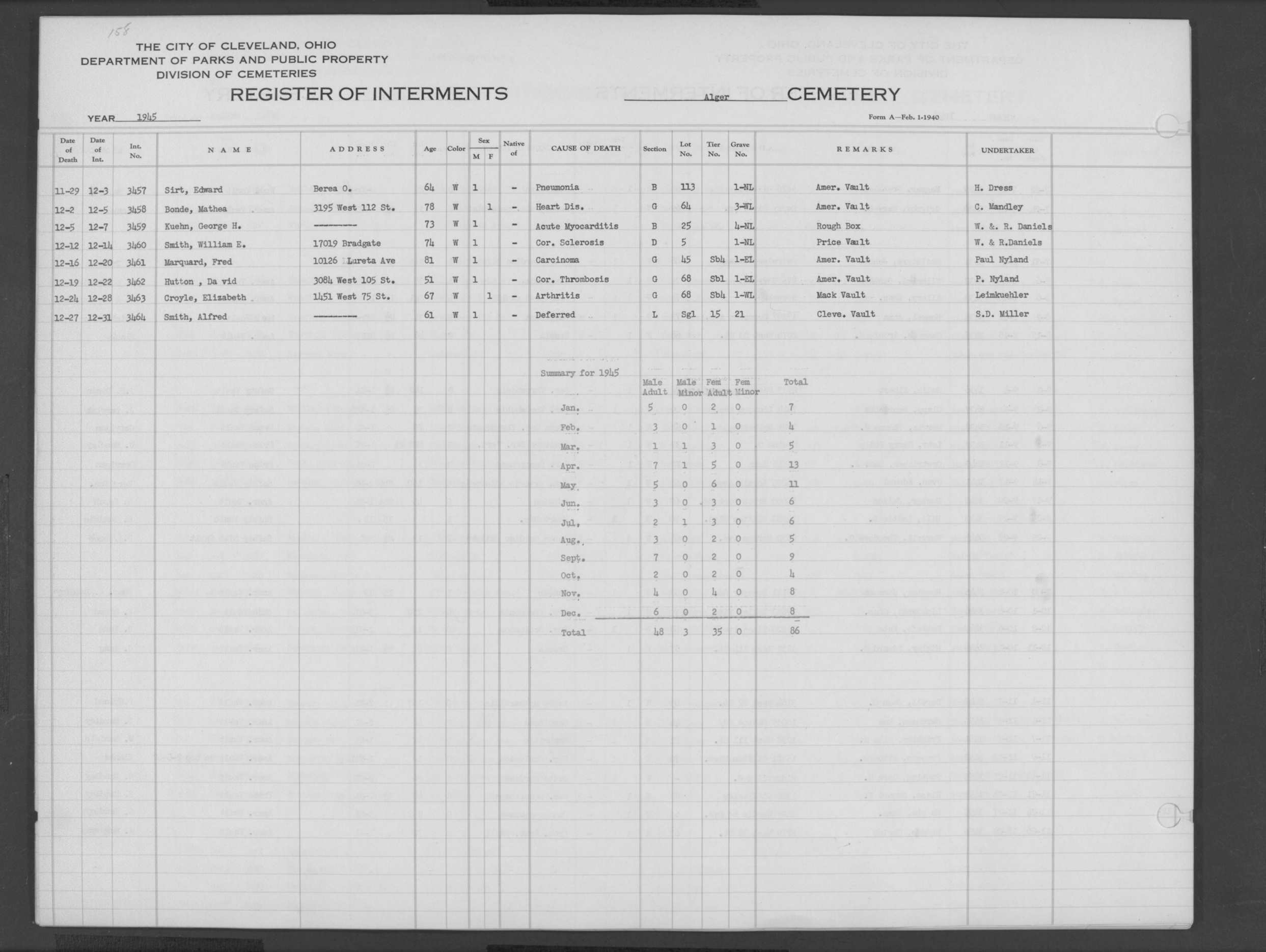 | Highland Park | 5 | 176 | May | 1 | 1952 | May | 5 | 1952 | 39536 | Smith, Julia | 71y | B | F | |