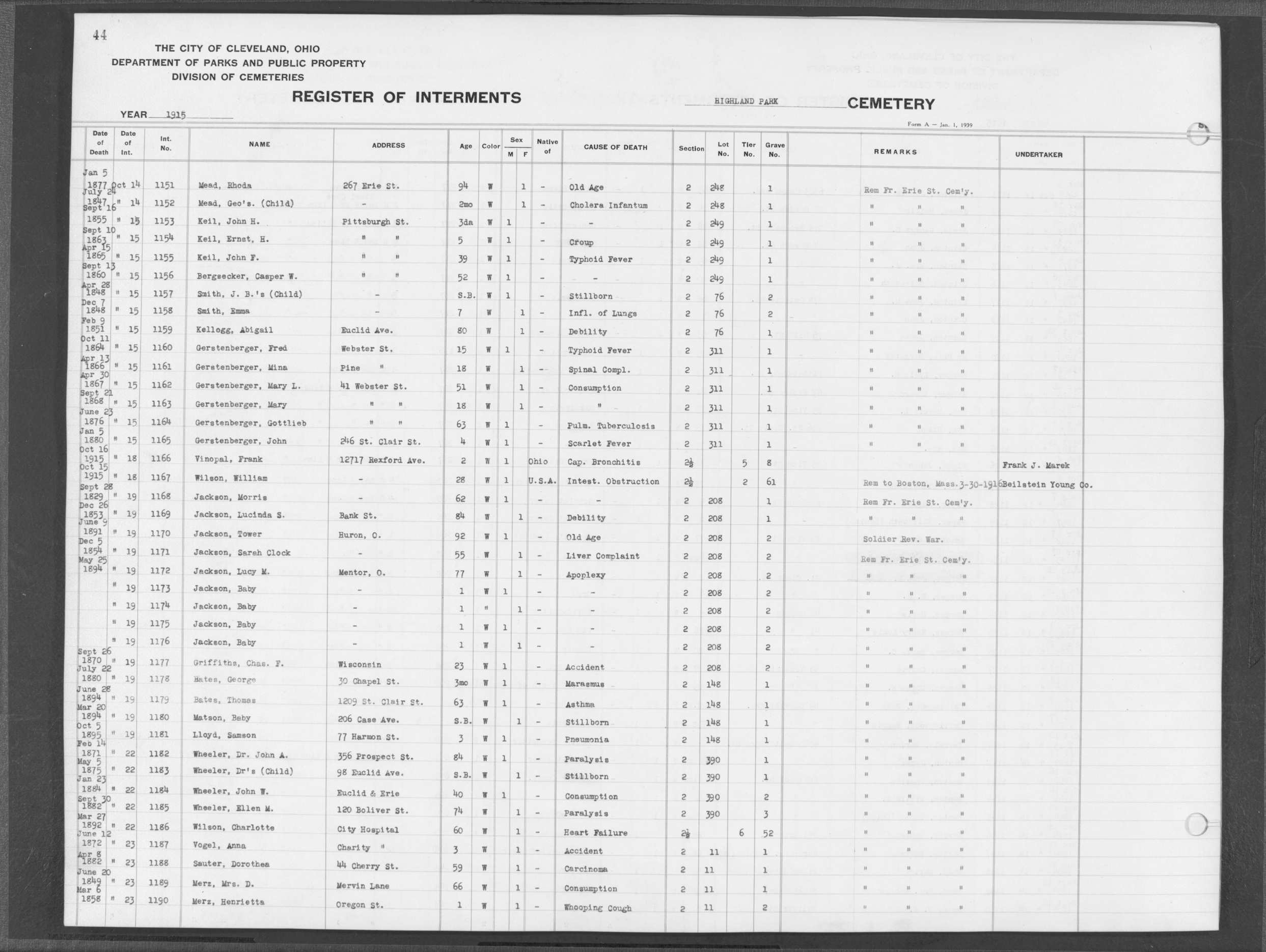 | Erie Street | 1 | 234 | Sep | 24 | 1864 | 9410 | Smith, | Child of Mrs | 1y | F | ||||