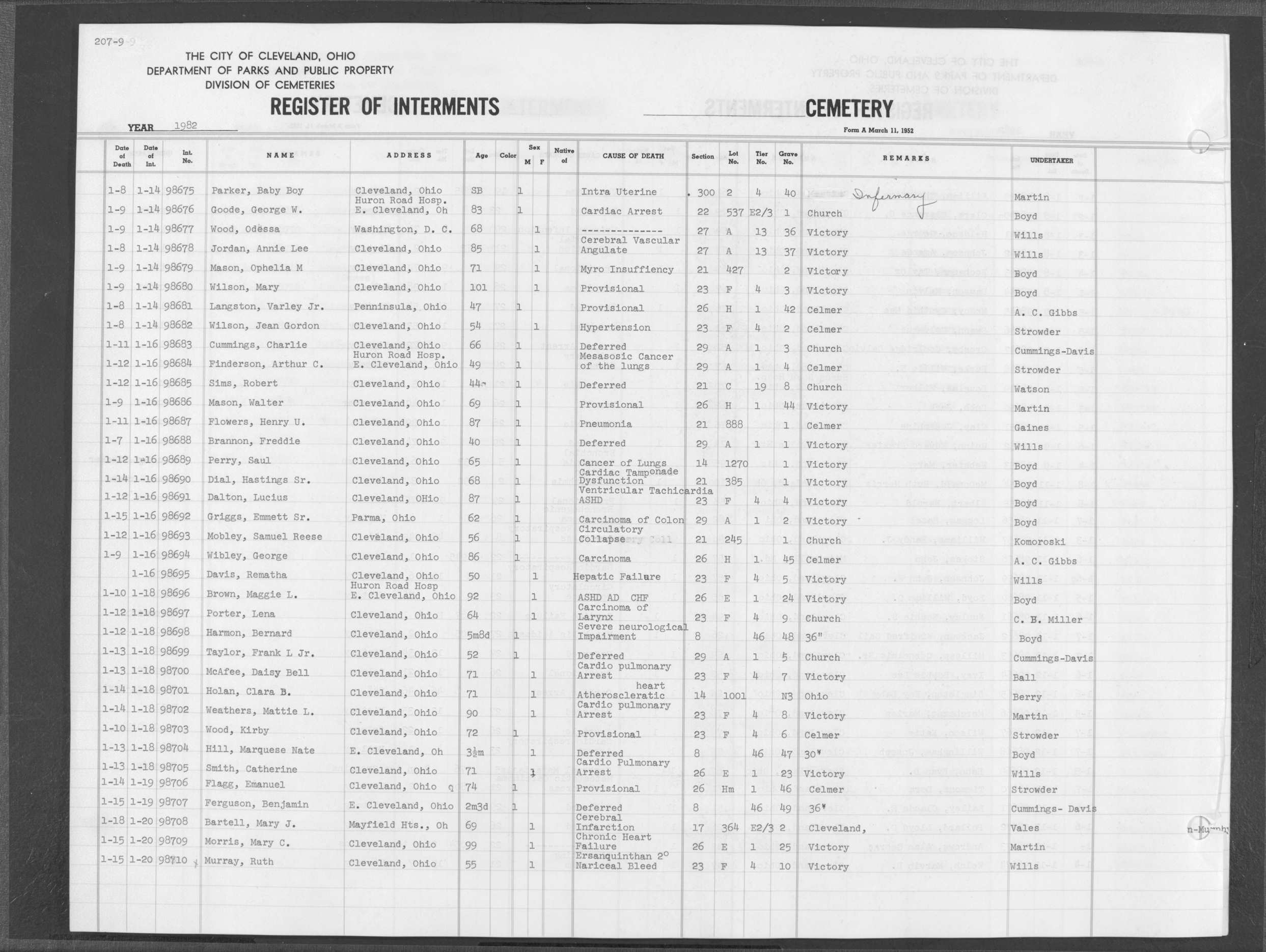 | Highland Park | 9 | 259 | Dec | 2 | 1982 | Dec | 2 | 1982 | 100458 | Smith, Jonah | 89y | M | ||