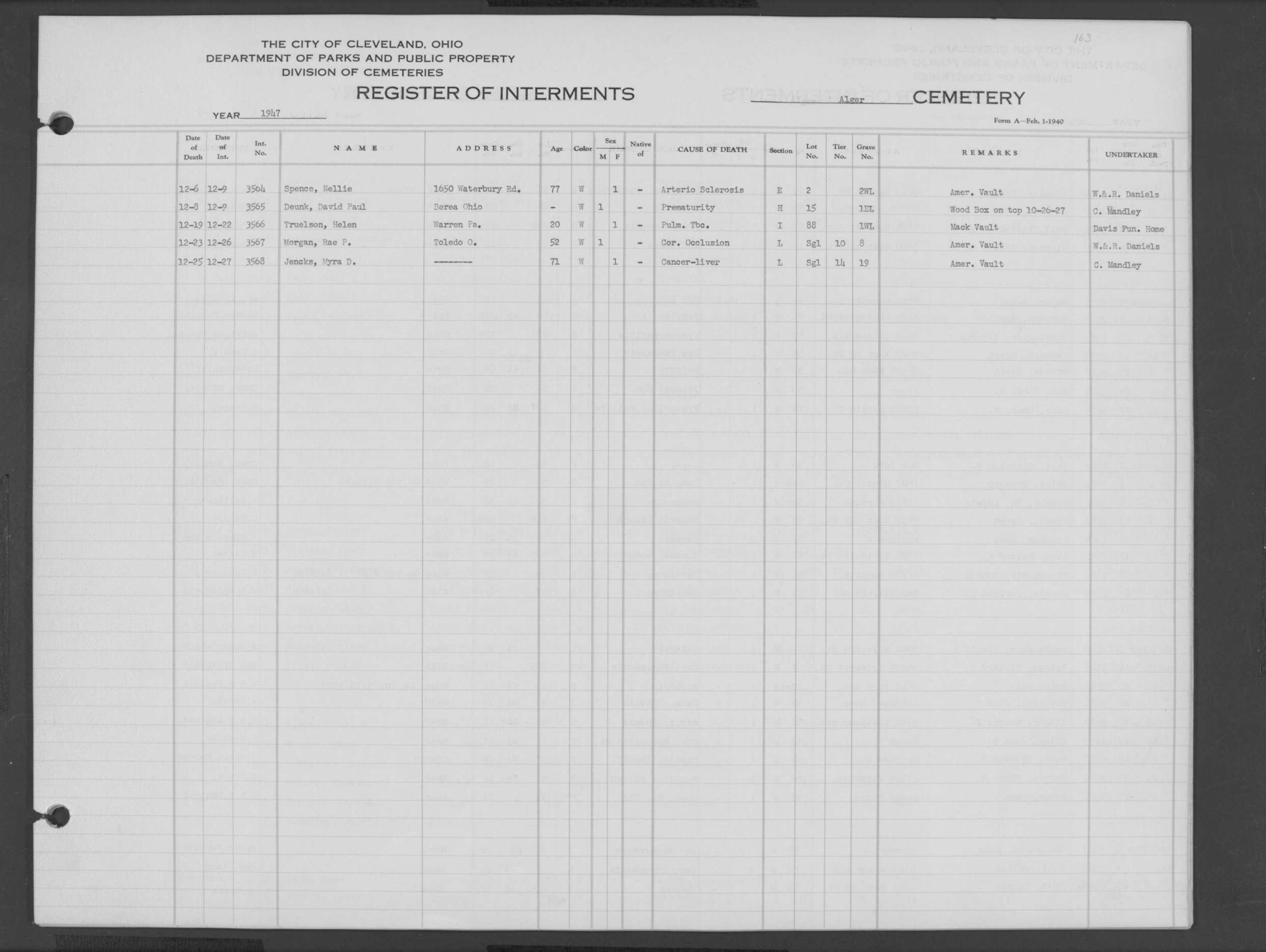 | Alger | 1 | 161 | Apr | 17 | 1947 | Apr | 19 | 1947 | 3534 | Zimmerman, Jacob J | 65y | W | M | |