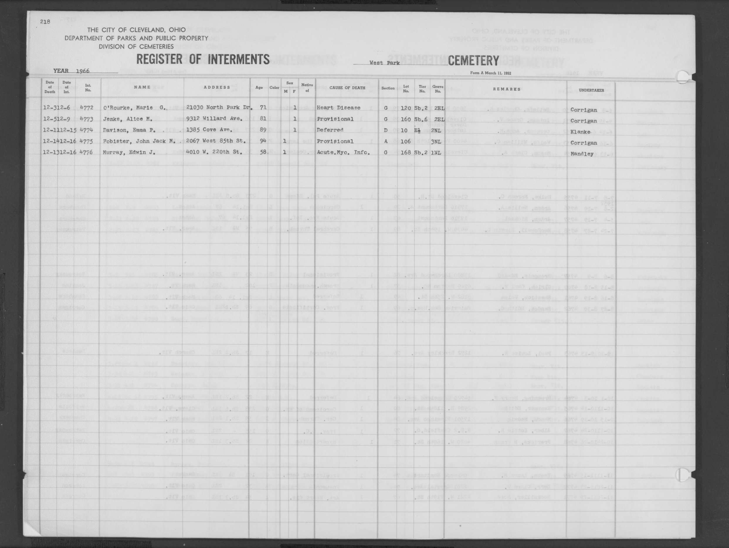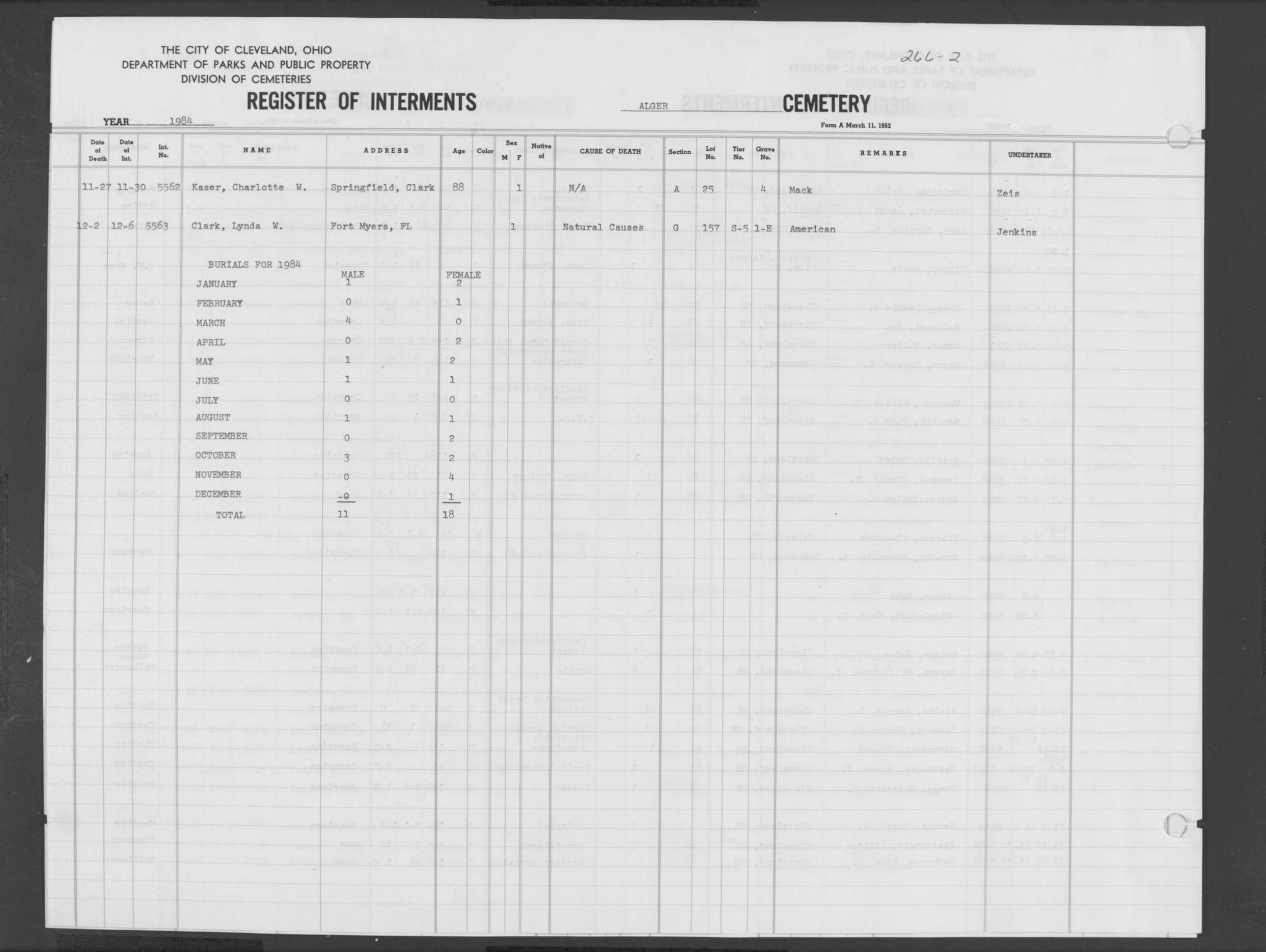 | Alger | 1 | 217 | Oct | 21 | 1966 | Oct | 24 | 1966 | 4767 | Alber, Lottie M | 77y | F | ||