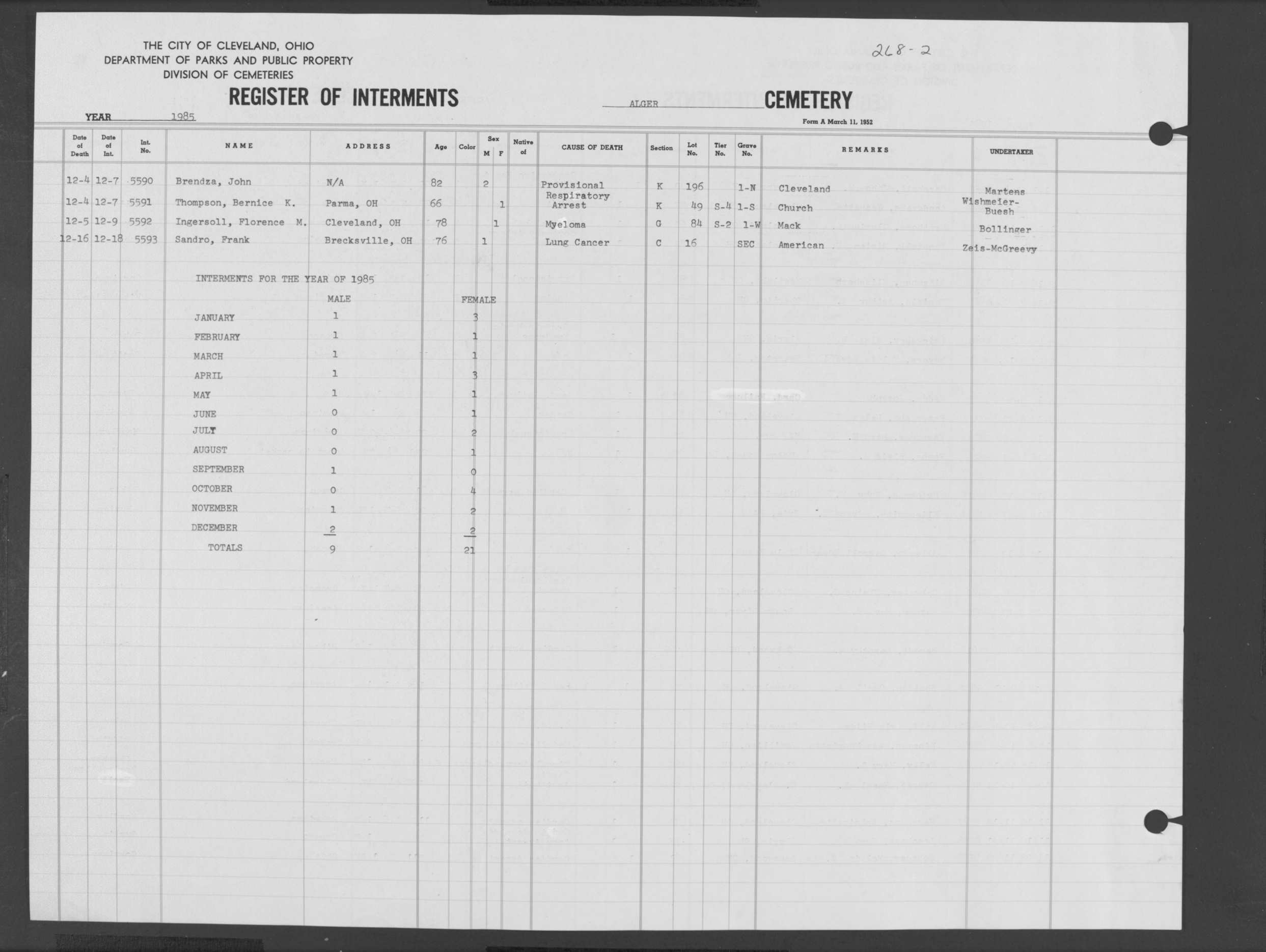 | Alger | 1 | 213 | Dec | 31 | 1964 | Jan | 2 | 1965 | 4668 | Wunderlich, Elizabeth | 90y | F | ||