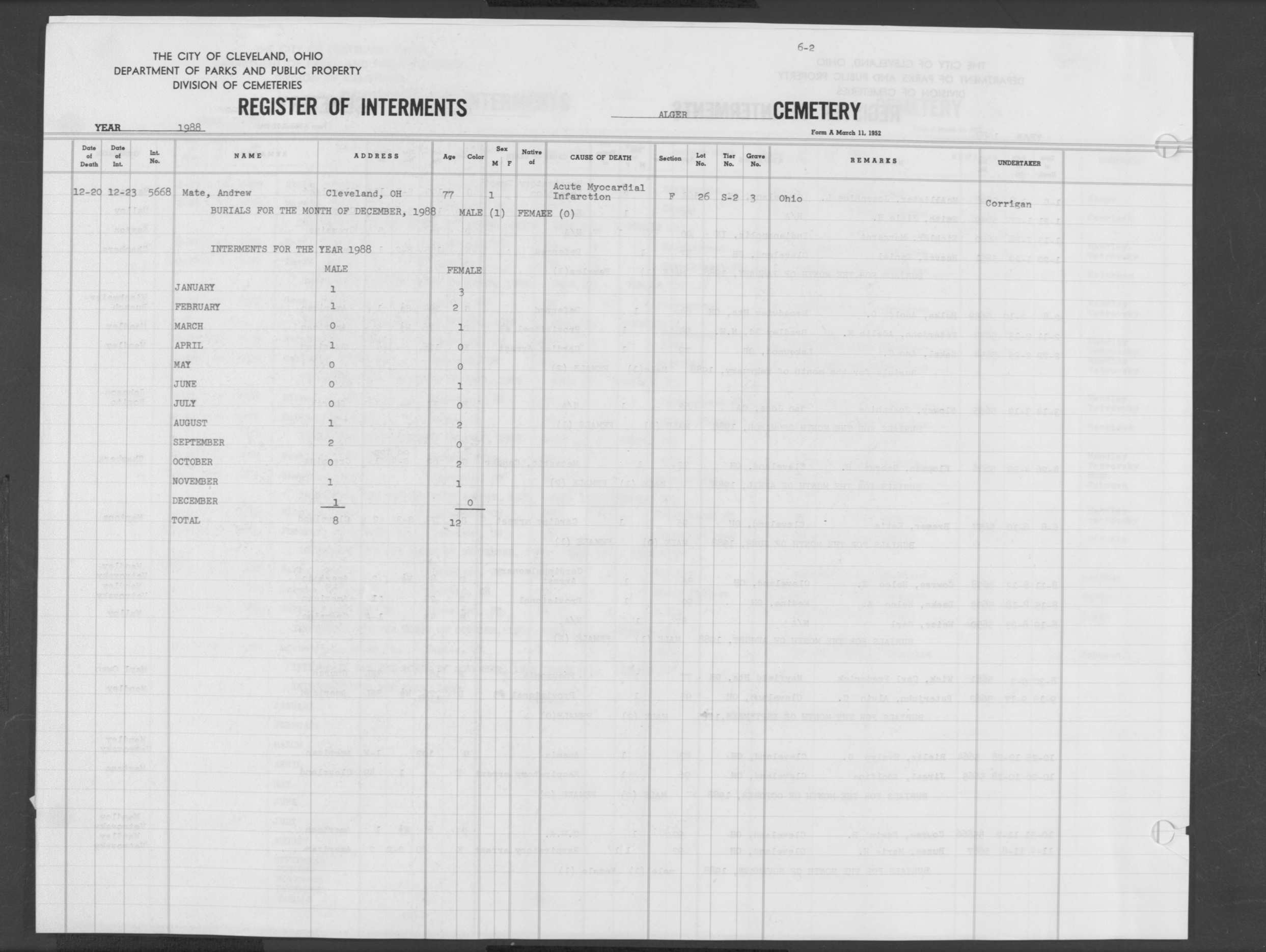 | Alger | 1 | 52 | Feb | 17 | 1919 | 1058 | Andrews, Frank B | 58y | W | M | ||||