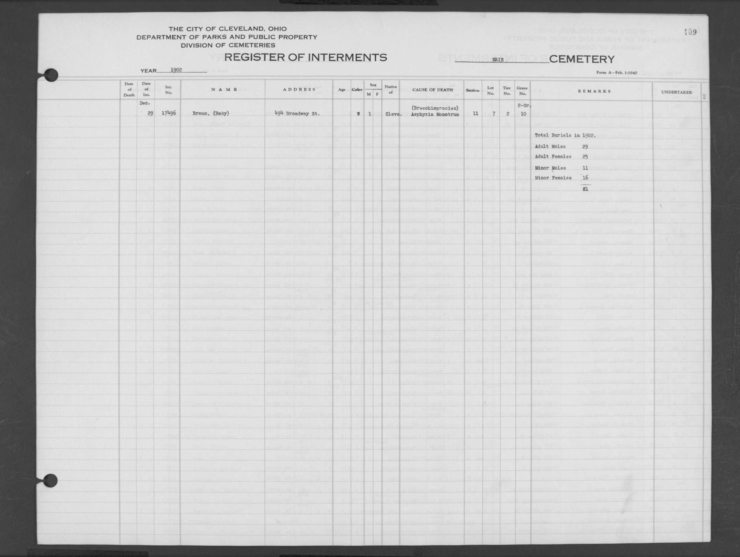| Erie Street | 2 | 110 | Jan | 30 | 1903 | 17504 | Abbey, Frank | 8m | W | M | ||||