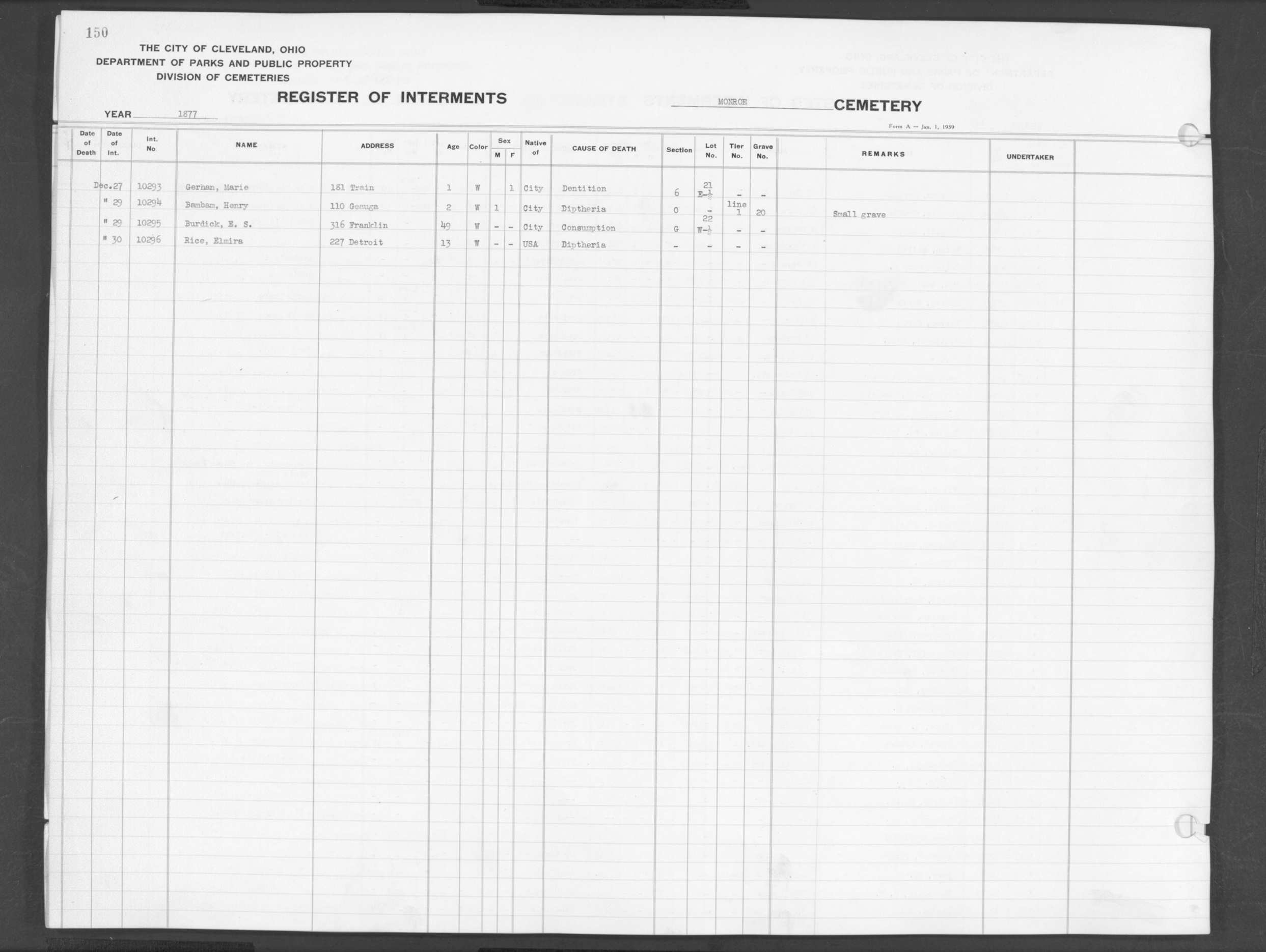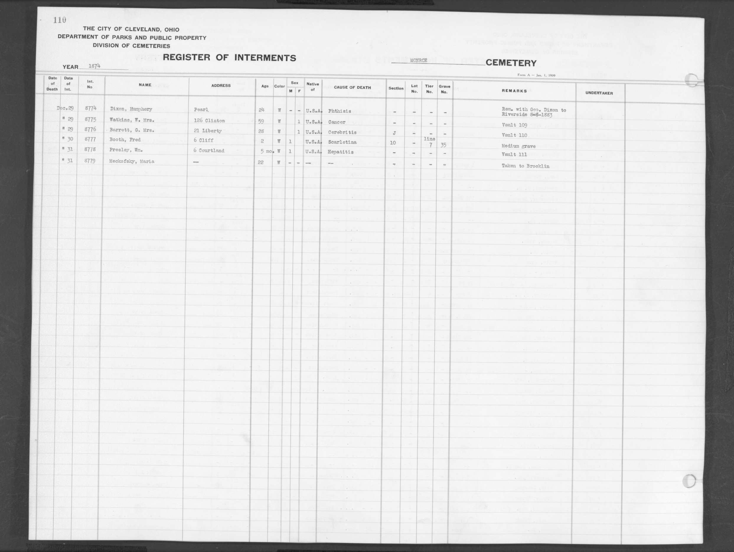 | Monroe Street | 1 | 103 | Jul | 14 | 1874 | 8529 | Rossow, Louisa | 6m | W | F | ||||