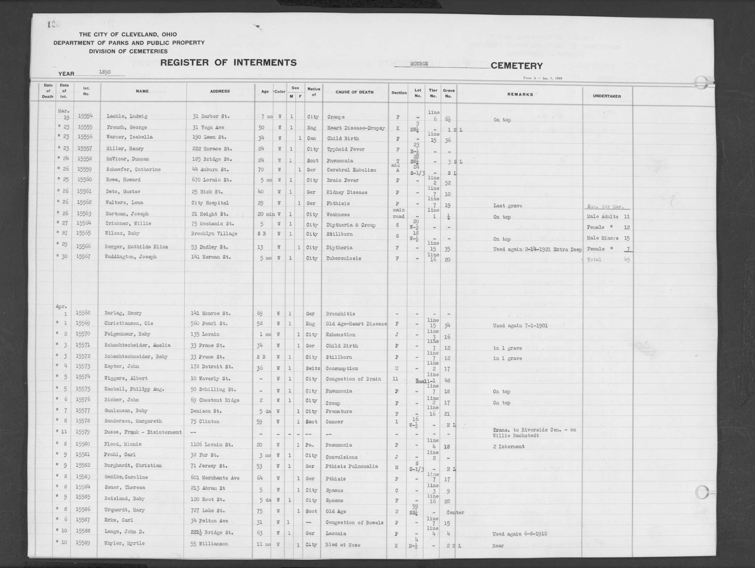 | Monroe Street | 2 | 217 | Jan | 15 | 1896 | 19011 | Rossow, William | 21d | W | M | ||||