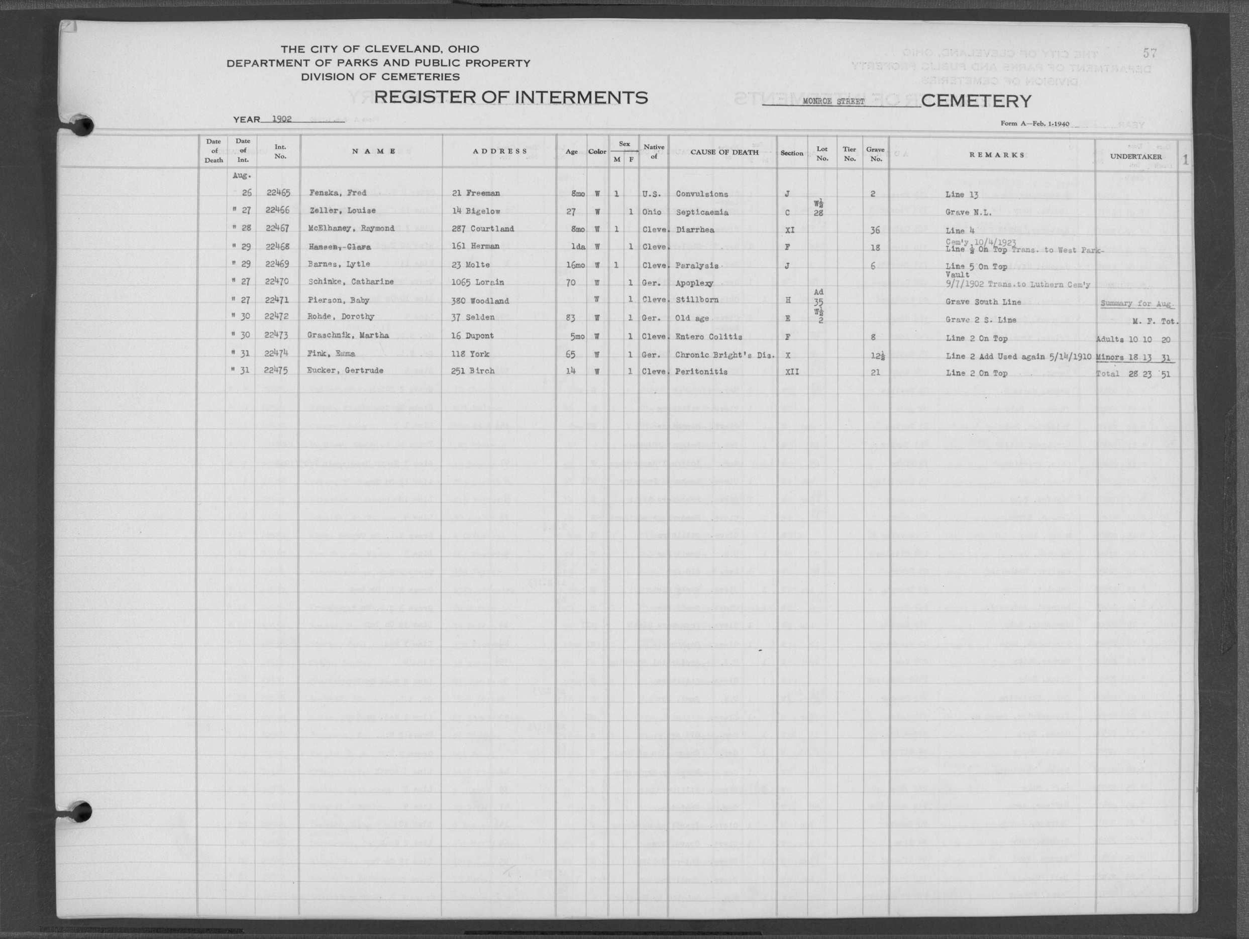| Monroe Street | 1 | 57 | Aug | 26 | 1870 | 6719 | Roth, | Child of Gottliel SB | W | F | ||||