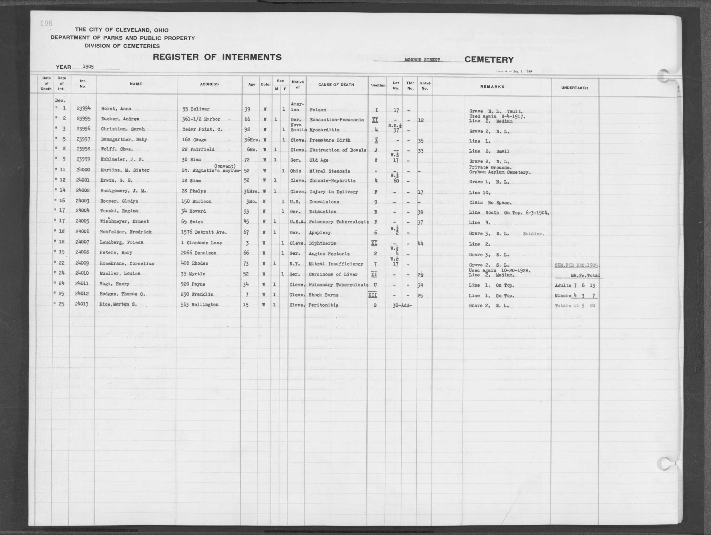 | Monroe Street | 3 | 107 | Jan | 18 | 1906 | 24027 | Peck, Norah | 45y | W | F | ||||