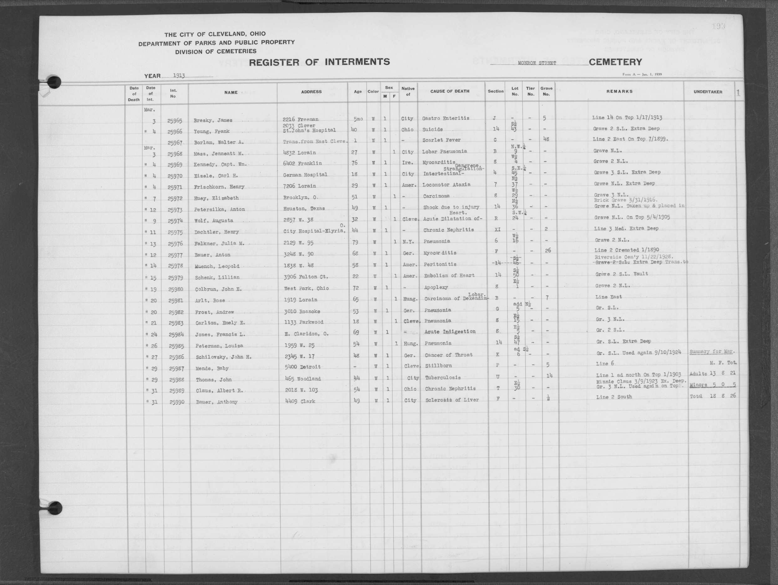 | Monroe Street | 3 | 192 | Feb | 1 | 1913 | 25944 | Pelow, Lawrence A | 70y | W | M | ||||
