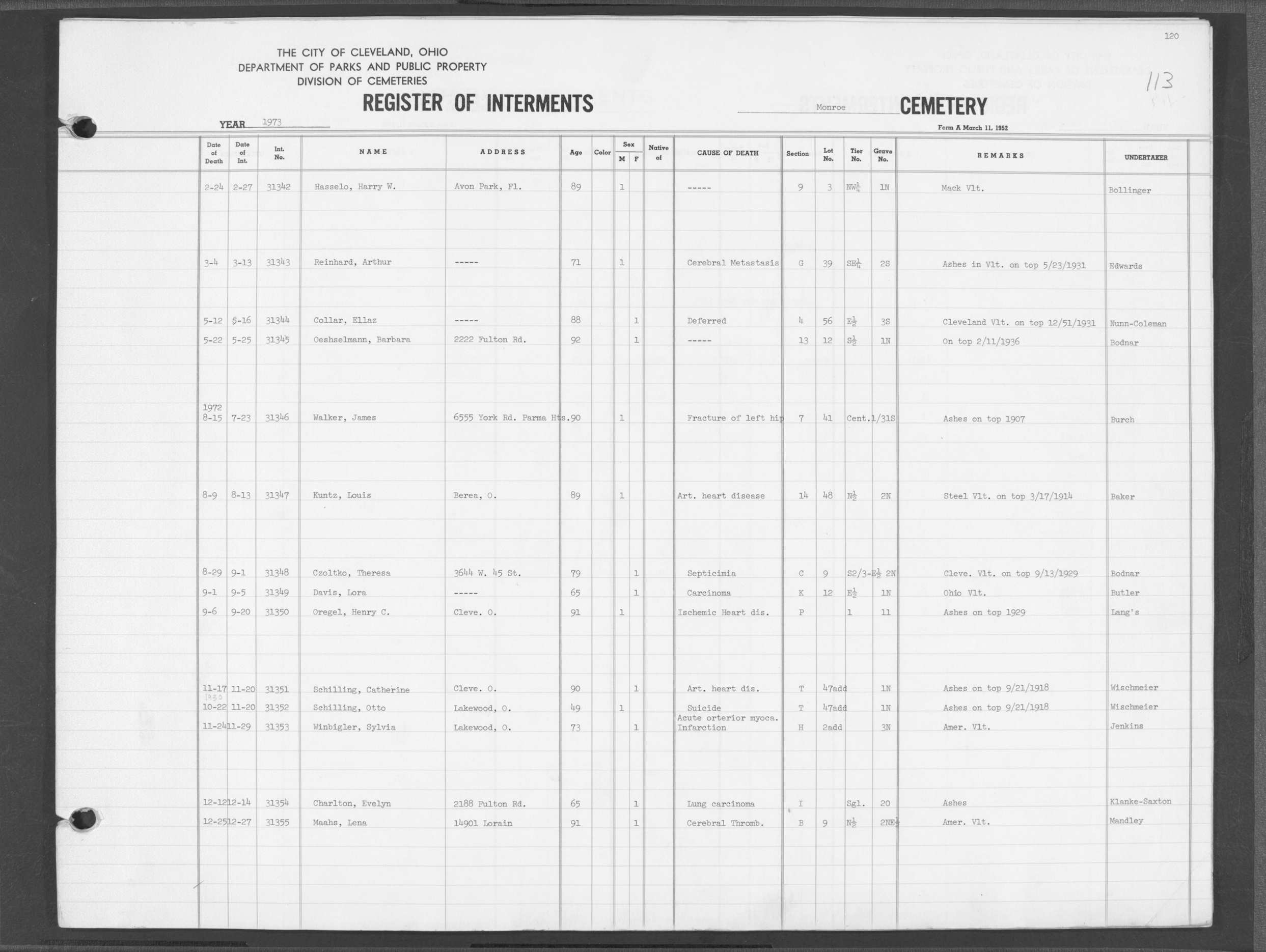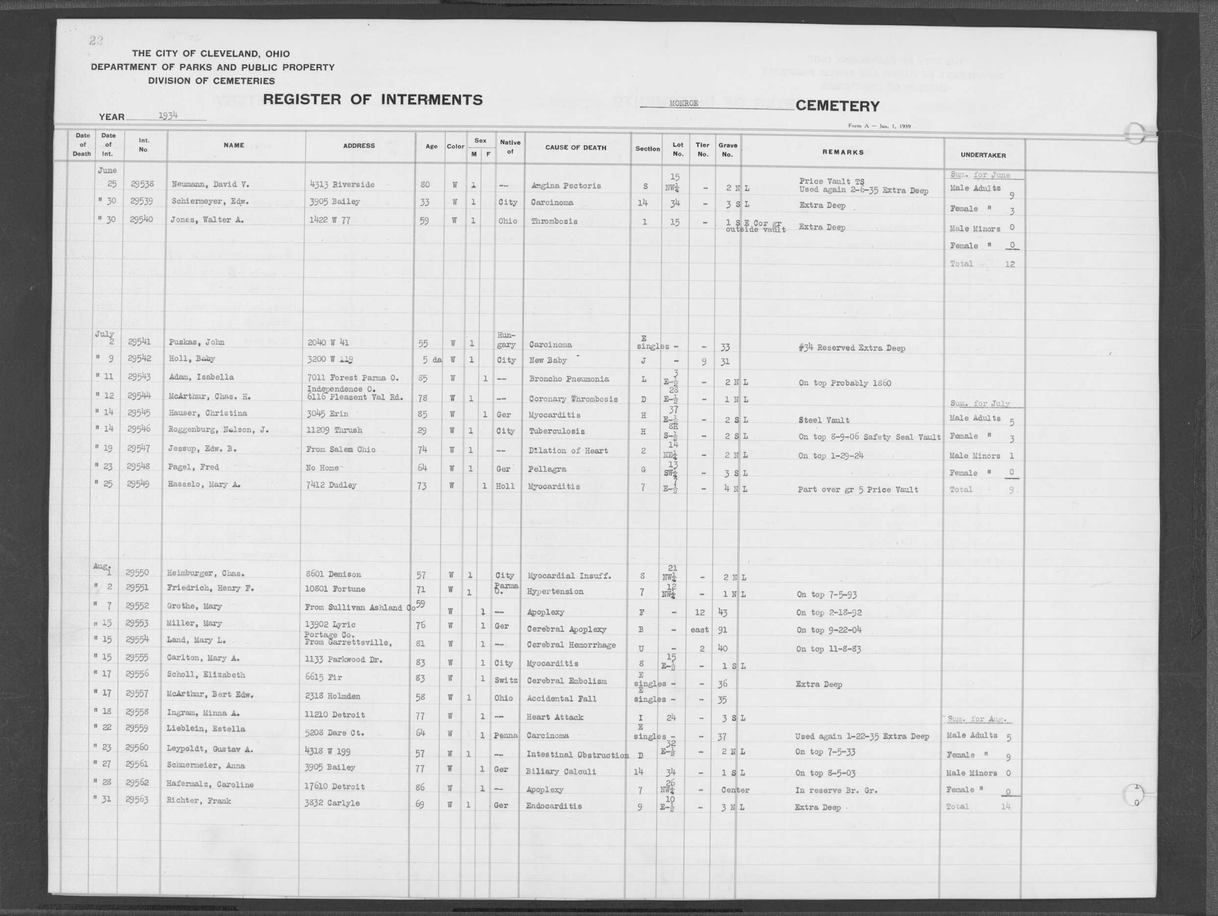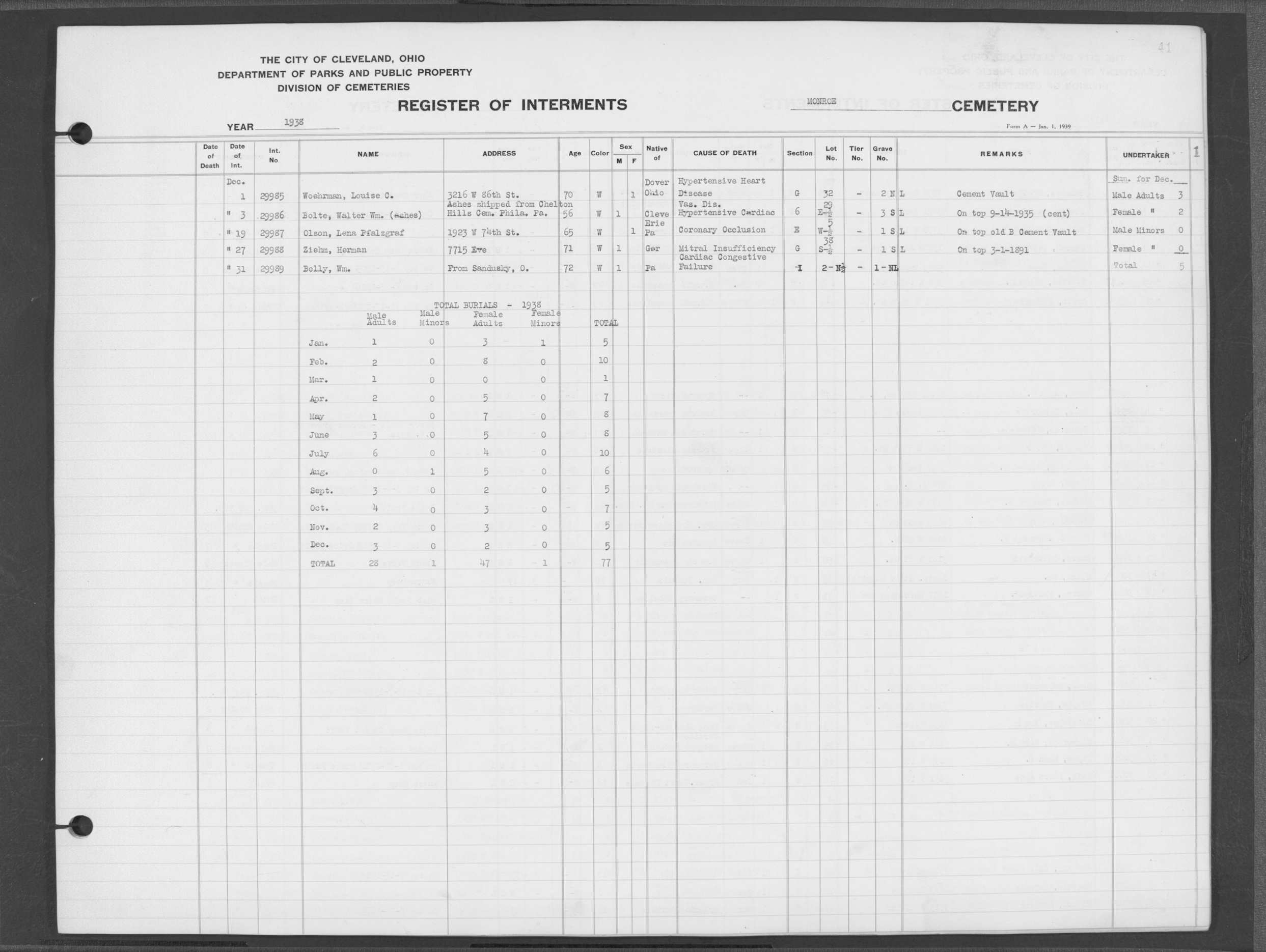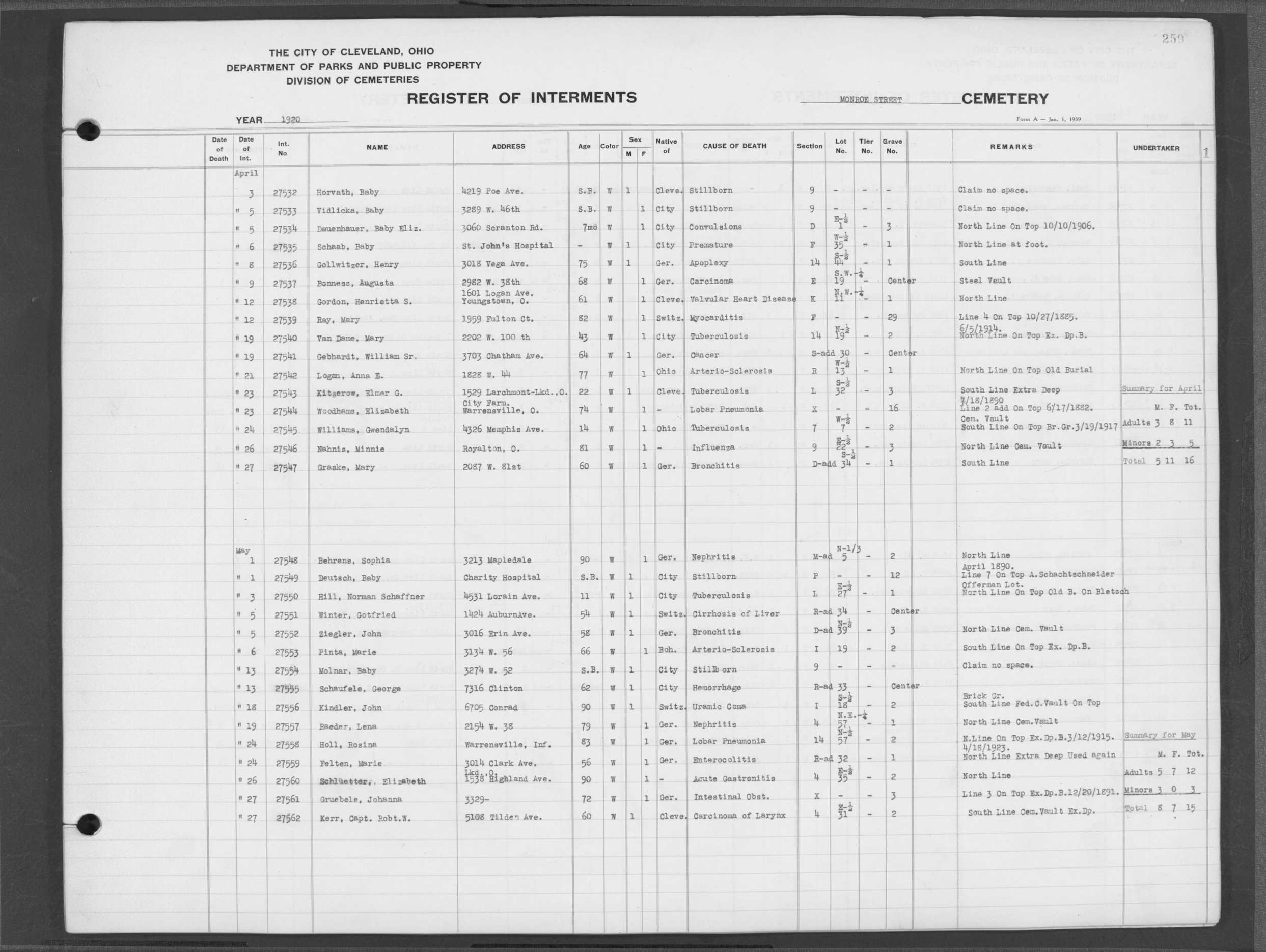 | Monroe Street | 4 | 7 | May | 16 | 1931 | 29196 | Ross, Cora D | 58y | W | F | ||||