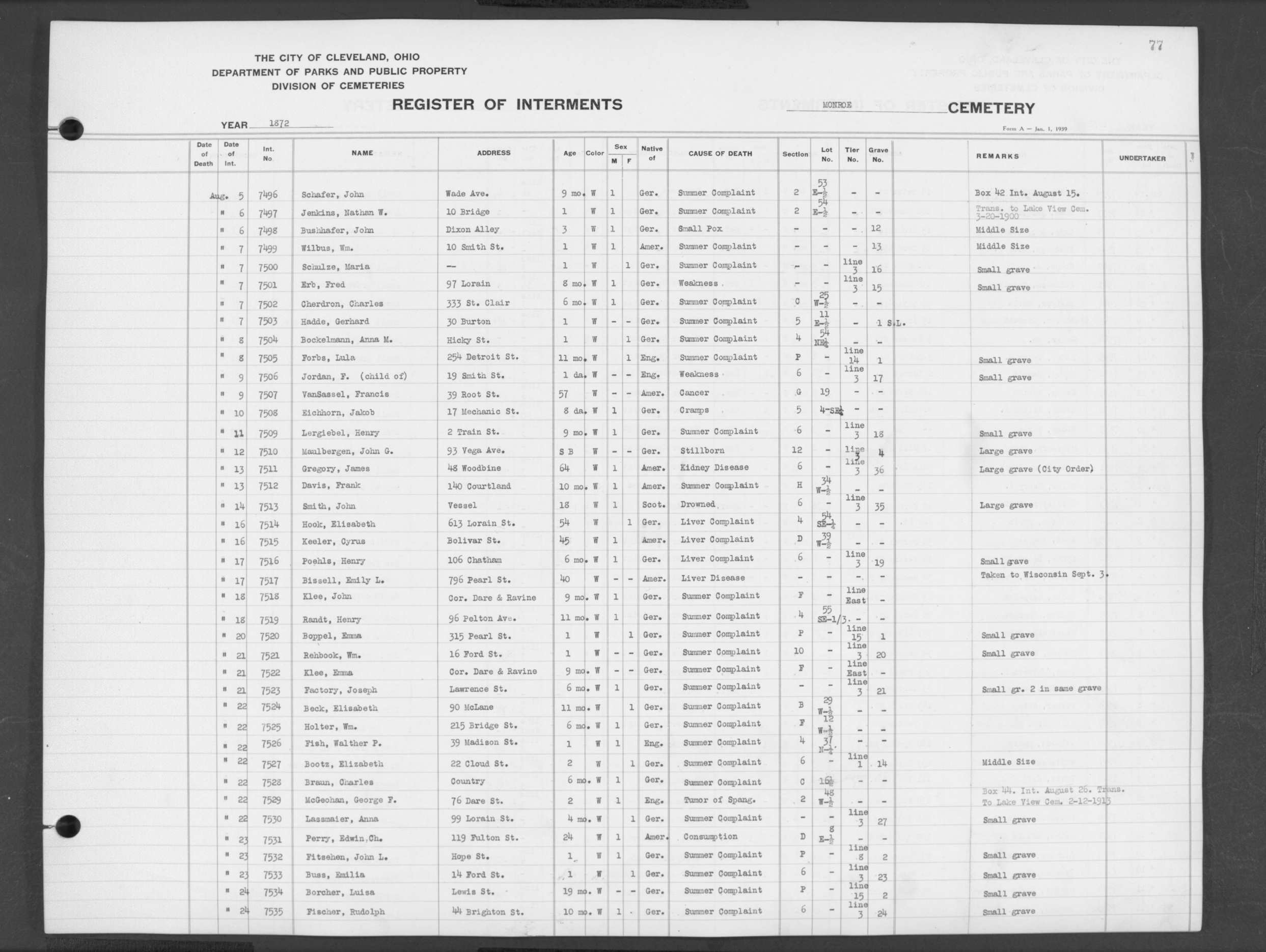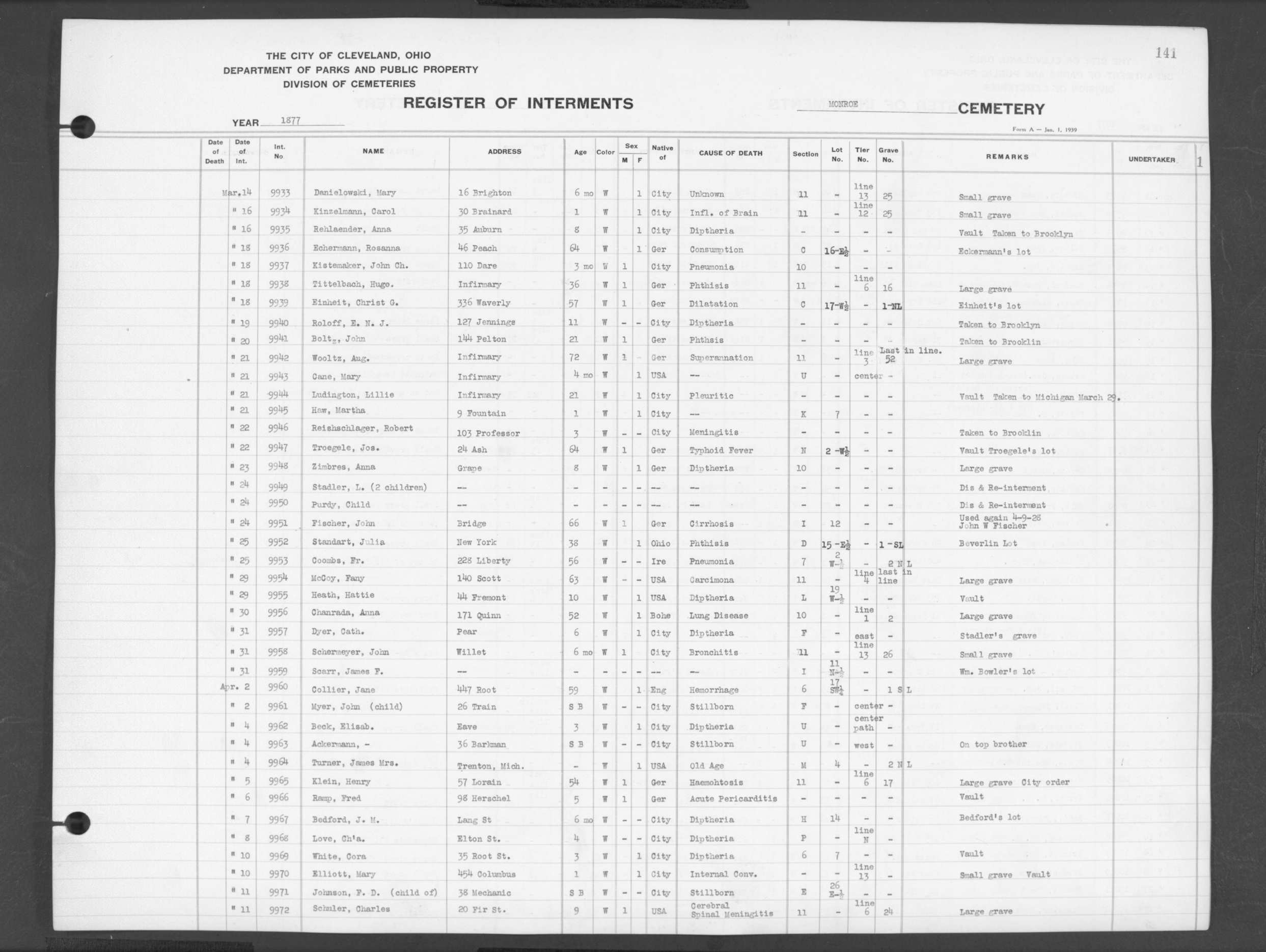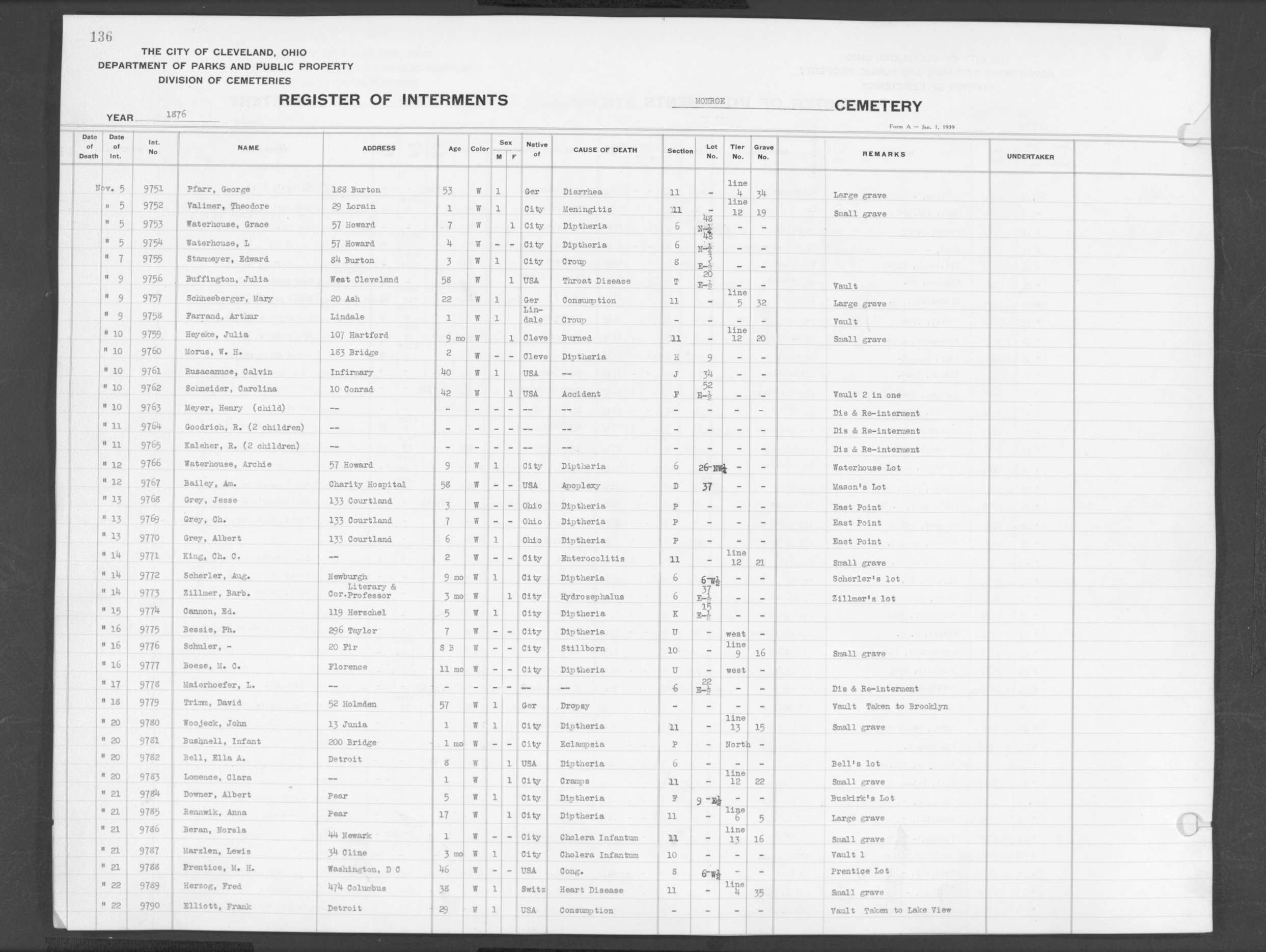 | Monroe Street | 1 | 132 | Aug | 21 | 1876 | 9619 | Sherfort, Henry | 13d | W | M | ||||