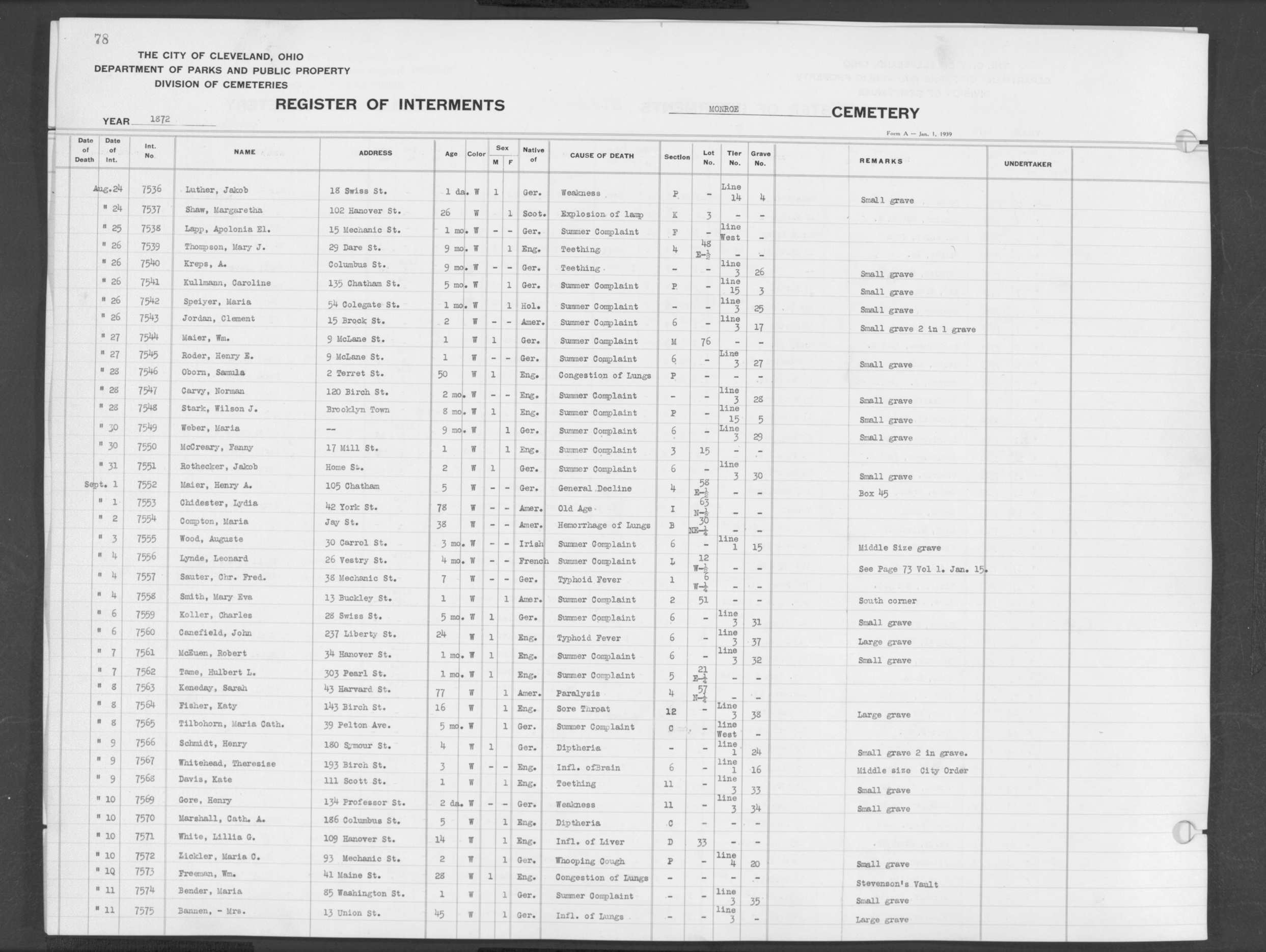 | Monroe Street | 1 | 78 | Aug | 24 | 1872 | 7537 | Shaw, Margaretha | 26y | W | F | ||||