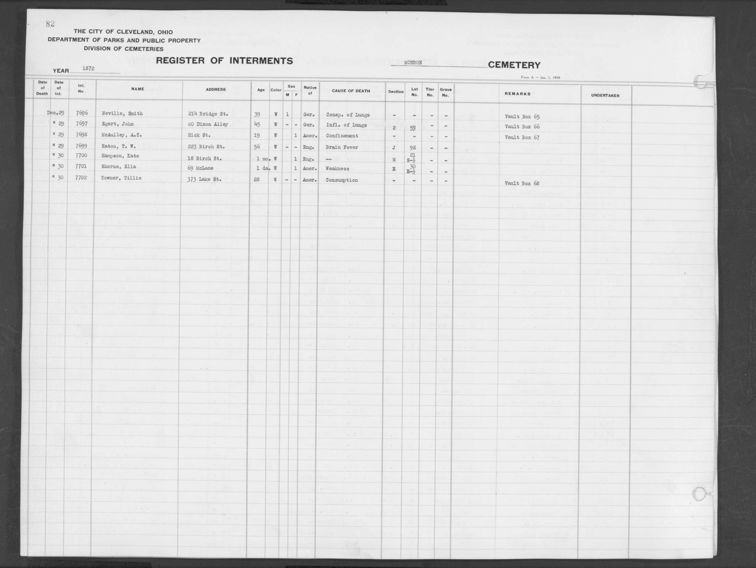 | Monroe Street | 1 | 151 | Feb | 12 | 1878 | 10328 | Shanks, Cath | 79y | W | F | ||||