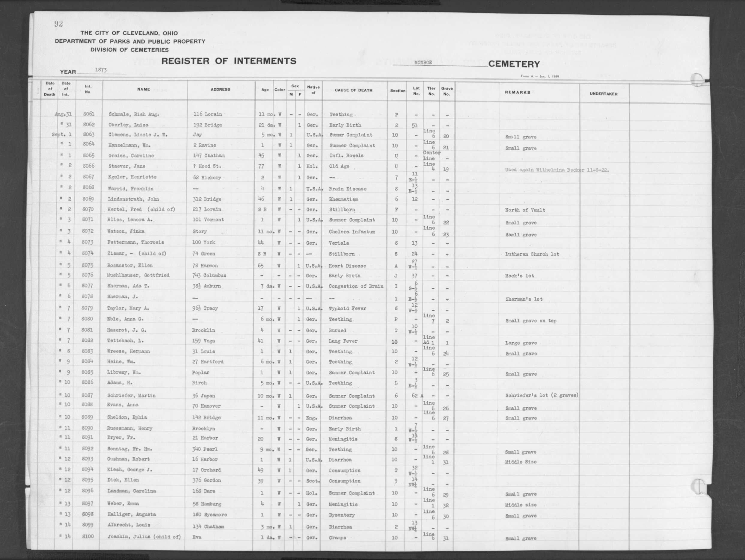 | Monroe Street | 1 | 92 | Sep | 10 | 1873 | 8089 | Sheldon, Ephia | 11m | W | |||||
