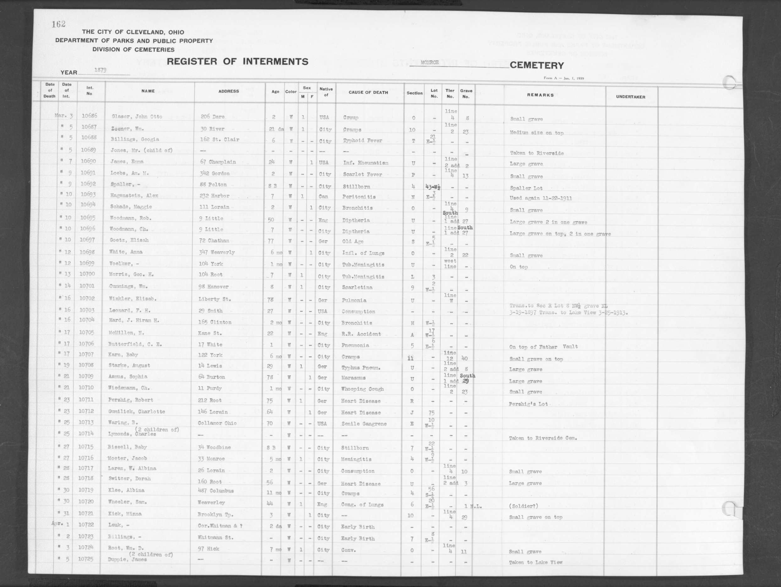 | Monroe Street | 1 | 162 | Mar | 28 | 1879 | 10718 | Switzer, Dorah | 56y | W | |||||