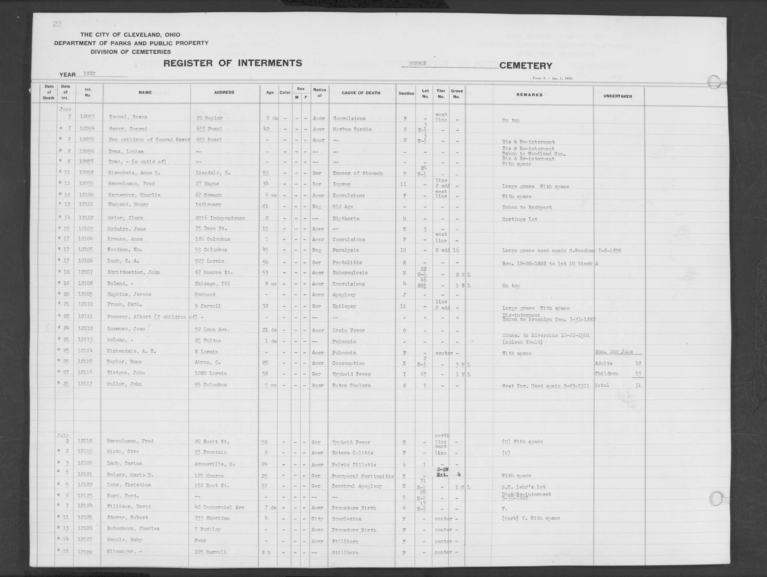 | Monroe Street | 2 | 22 | Jun | 12 | 1882 | 12101 | Shepard, Henry | 81y | ||||||