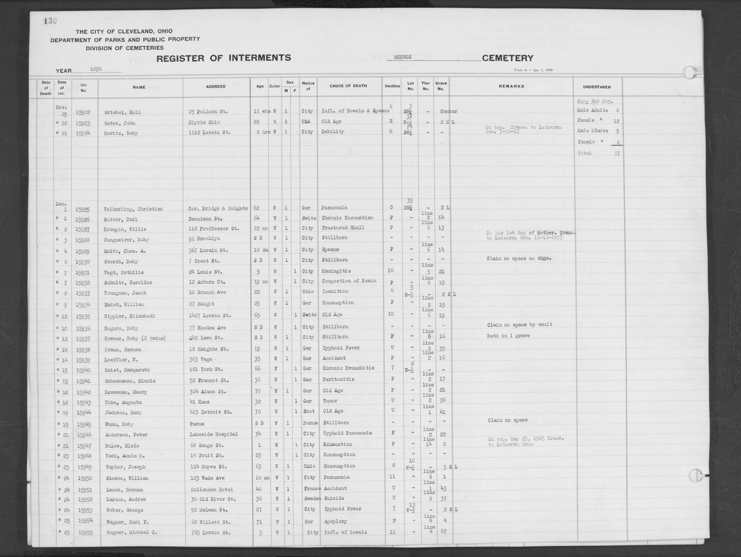 | Monroe Street | 2 | 130 | Dec | 1 | 1890 | 15926 | Sutter, Carl | 64y | W | M | ||||